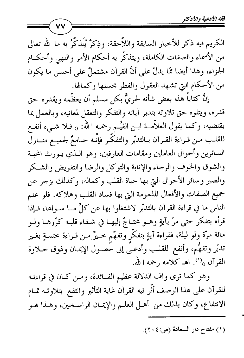 إنَّ كتاباً هذا بعض شأنه لحريٌّ بكل مسلم أن يعظّمه ويقدره حق قدره، ويتلوه حق تلاوته بتدبر آياته والتفكر والتعقل لمعانيه، وبالعمل بما يقتضيه، وكما يقول العلاّمة ابن القيِّم رحمه الله: "فلا شيء أنفع للقلب من قراءة القرآن بالتدبّر والتفكّر فإنَّه جامعٌ لجميع منازل السائرين وأحوال العاملين ومقامات العارفين، وهو الذي يورث المحبة والشوق والخوف والرجاء والإنابة والتوكل والرضا والتفويض والشكر والصبر وسائر الأحوال التي بها حياة القلب وكماله، وكذلك يزجر عن جميع الصفات والأفعال المذمومة التي بها فساد القلب وهلاكه. فلو علم الناس ما في قراءة القرآن بالتدبّر لاشتغلوا بها عن كلِّ ما سواها، فإذا قرأه بتفكر حتى مرّ بآيةٍ وهو محتاجٌ إليها في شفاء قلبه كرّرها ولو مائة مرّة ولو ليلة، فقراءة آيةٍ بتفكّرٍ وتفهّمٍ خيرٌ من قراءة ختمةٍ بغير تدبّر وتفهُّم، وأنفع للقلب وأدعى إلى حصول الإيمان وذوق حلاوة القرآن"1. اهـ كلامه رحمه الله.