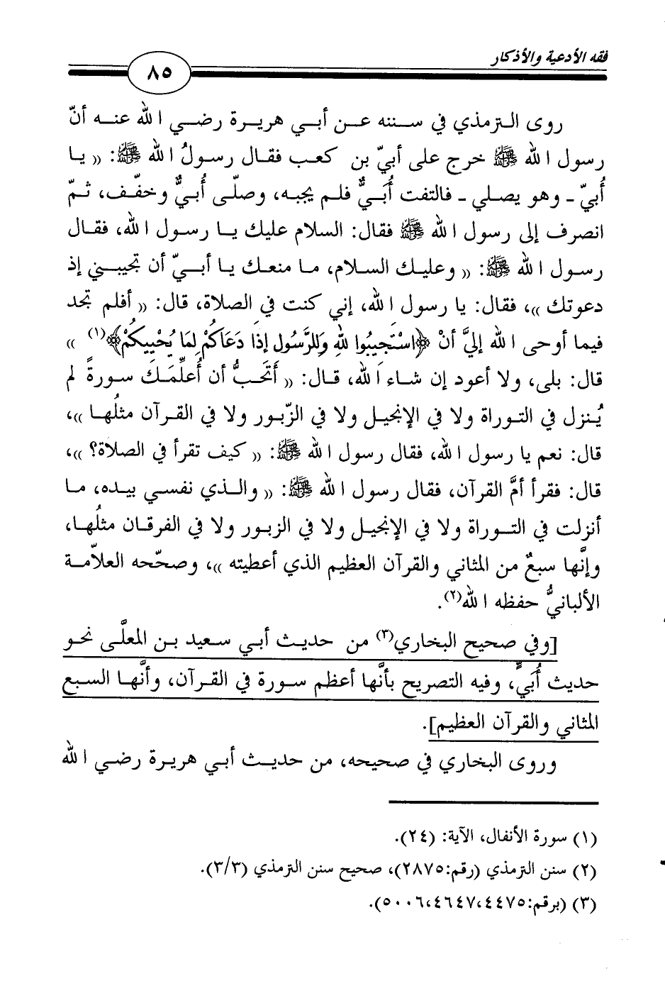 روى الترمذي في سننه عن أبي هريرة رضي الله عنه أنّ رسول الله صلى الله عليه وسلم خرج على أبيّ بن كعب فقال رسولُ الله صلى الله عليه وسلم: "يا أُبيّ ـ وهو يصلي ـ فالتفت أُبَيٌّ فلم يجبه، وصلّى أُبيٌّ وخفّف، ثمّ انصرف إلى رسول الله صلى الله عليه وسلم فقال: السلام عليك يا رسول الله، فقال رسول الله صلى الله عليه وسلم: "وعليك السلام، ما منعك يا أبيّ أن تجيبني إذ دعوتك"، فقال: يا رسول الله، إني كنت في الصلاة، قال: "أفلم تجد فيما أوحى الله إليَّ أنْ {اسْتَجِيبُوا للهِ وَلِلرَّسُولِ إِذَا دَعَاكُمْ لِمَا يُحْيِيكُمْ} 1") قال: بلى، ولا أعود إن شاء الله، قال: "أتحبُّ أن أُعلِّمَك سورةً لم يُنزل في التوراة ولا في الإنجيل ولا في الزّبور ولا في القرآن مثلُها"، قال: نعم يا رسول الله، فقال رسول الله صلى الله عليه وسلم: "كيف تقرأ في الصلاة؟ "، قال: فقرأ أمَّ القرآن، فقال رسول الله صلى الله عليه وسلم: "والذي نفسي بيده، ما أنزلت في التوراة ولا في الإنجيل ولا في الزبور ولا في الفرقان مثلُها، وإنَّها سبعٌ من المثاني والقرآن العظيم الذي أعطيته"، وصحّحه العلاّمة الألبانيُّ حفظه الله2.