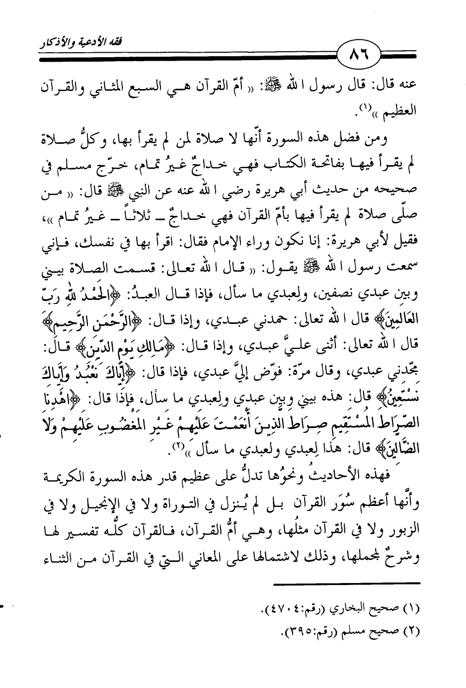 ومن فضل هذه السورة أنّها لا صلاة لمن لم يقرأ بها، وكلُّ صلاة لم يقرأ فيها بفاتحة الكتاب فهي خداجٌ غيرُ تمام، خرّج مسلم في صحيحه من حديث أبي هريرة رضي الله عنه عن النبي صلى الله عليه وسلم قال: "من صلّى صلاة لم يقرأ فيها بأمّ القرآن فهي خداجٌ ـ ثلاثاً ـ غيرُ تمام"، فقيل لأبي هريرة: إنا نكون وراء الإمام فقال: اقرأ بها في نفسك، فإني سمعت رسول الله صلى الله عليه وسلم يقول: "قال الله تعالى: قسمت الصلاة بيني وبين عبدي نصفين، ولِعبدي ما سأل، فإذا قال العبدُ: {الحَمْدُ للهِ رَبِّ العَالَمِينَ} قال الله تعالى: حمدني عبدي، وإذا قال: {الرَّحْمَنِ الرَّحِيمِ} قال الله تعالى: أثنى عليَّ عبدي، وإذا قال: {مَالِكِ يَوْمِ الدِّينِ} قال: مجّدني عبدي، وقال مرّة: فوّض إليَّ عبدي، فإذا قال: {إِيَّاكَ نَعْبُدُ وَإِيَّاكَ نَسْتَعِينُ} قال: هذه بيني وبين عبدي ولِعبدي ما سأل، فإذا قال: {اهْدِنَا الصِّرَاطَ المُسْتَقِيمِ صِرَاطَ الَّذِينَ أَنْعَمْتَ عَلَيْهِمْ غَيْرِ المَغْضُوبِ عَلَيْهِمْ وَلاَ الضَّالِّينَ} قال: هذا لِعبدي ولعبدي ما سأل"2.