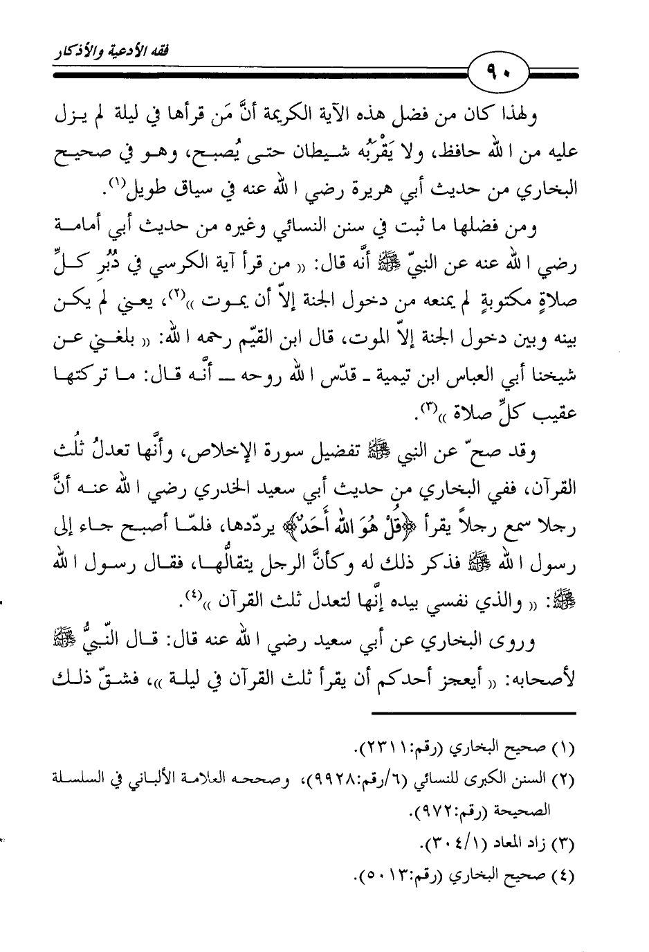 وقد صحّ عن النبي صلى الله عليه وسلم تفضيل سورة الإخلاص، وأنَّها تعدلُ ثلُث القرآن، ففي البخاري من حديث أبي سعيد الخدري رضي الله عنه أنَّ رجلا سمع رجلاً يقرأ {قُلْ هُوَ الله أَحَدٌ} يردّدها، فلمّا أصبح جاء إلى رسول الله صلى الله عليه وسلم فذكر ذلك له وكأنَّ الرجل يتقالُّها، فقال رسول الله صلى الله عليه وسلم: "والذي نفسي بيده إنَّها لتعدل ثلث القرآن"4.