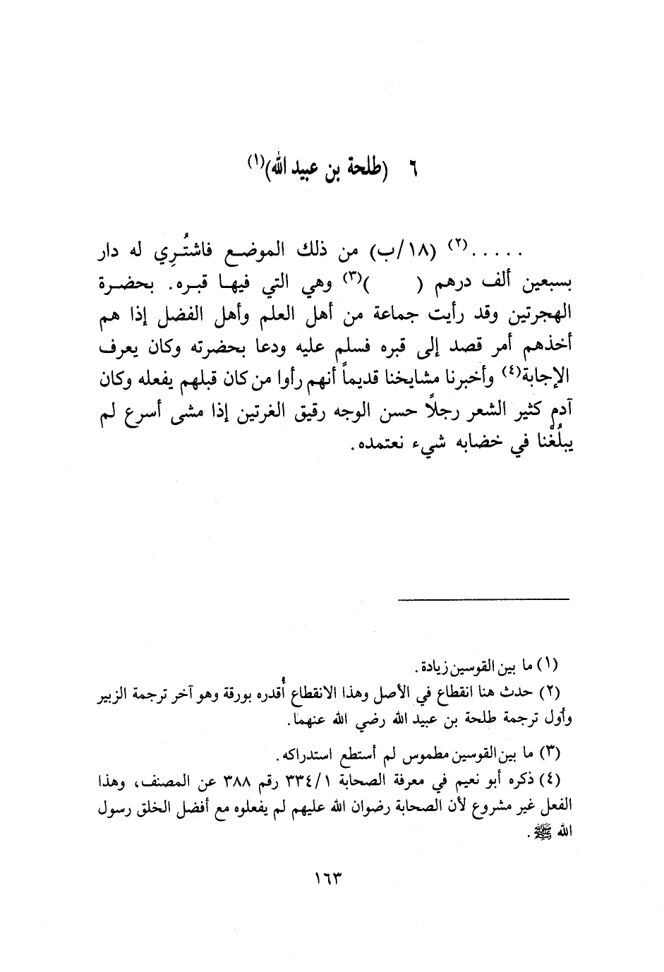 §طَلْحَةُ بْنُ عُبَيْدِ اللَّهِ. . . مِنْ ذَلِكَ الْمَوْضِعِ فَاشْتُرِيَ لَهُ دَارٌ بِسَبْعِينَ أَلْفَ دِرْهَمٍ وَهِيَ الَّتِي فِيهَا قَبْرُهُ بِحَضْرَةِ الْهِجْرَتَيْنِ وَقَدْ رَأَيْتُ جَمَاعَةً مِنْ أَهْلِ الْعِلْمِ وَأَهْلِ الْفَضْلِ إِذَا هُمْ أَخَذَهُمْ أَمْرٌ قَصَدَ إِلَى قَبْرِهِ فَسَلَّمَ عَلَيْهِ وَدَعَا بِحَضْرَتِهِ، وَكَانَ يَعْرِفُ الْإِجَابَةَ، وَأَخْبَرَنَا مَشَايِخُنَا قَدِيمًا أَنَّهُمْ رَأَوْا مَنْ كَانَ قَبْلَهُمْ يَفْعَلُهُ، وَكَانَ آدَمَ كَثِيرَ الشَّعْرِ رَجِلًا حَسَنَ الْوَجْهِ، رَقِيقَ الْغُرَّتَيْنِ إِذَا مَشَى أَسْرَعَ، لَمْ يَبْلُغْنَا فِي خِضَابِهِ شَيْءٌ نَعْتَمِدُهُ