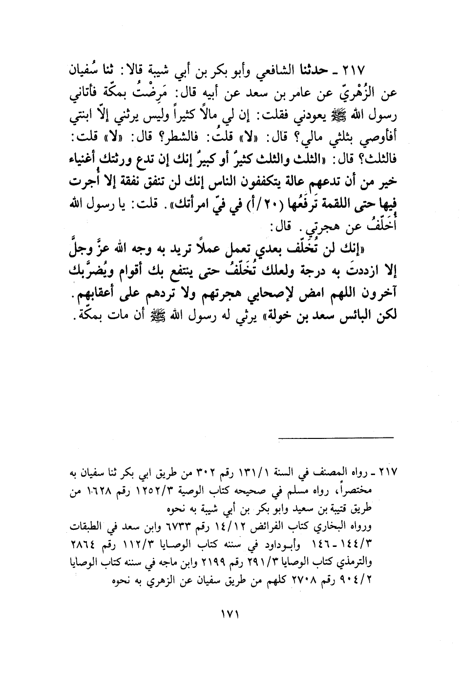 217 - حَدَّثَنَا الشَّافِعِيُّ، وَأَبُو بَكْرِ بْنُ أَبِي شَيْبَةَ، قَالَا: ثنا سُفْيَانُ، عَنِ الزُّهْرِيِّ، عَنْ عَامِرِ بْنِ سَعْدٍ، عَنْ أَبِيهِ، قَالَ: مَرِضْتُ بِمَكَّةَ فَأَتَانِي رَسُولُ اللَّهِ صَلَّى اللهُ عَلَيْهِ وَسَلَّمَ يَعُودُنِي فَقُلْتُ: إِنَّ لِي مَالًا كَثِيرًا، وَلَيْسَ يَرِثُنِي إِلَّا ابْنَتِي، أَفَأُوصِي بِثُلُثَيْ مَالِي؟ قَالَ: «لَا» قُلْتُ: فَالشَّطْرُ؟ قَالَ: «لَا» قُلْتُ: فَالثُّلُثُ؟ قَالَ: «§الثُّلُثُ، وَالثُّلُثُ كَثِيرٌ أَوْ كَبِيرٌ، إِنَّكَ إِنْ تَدَعْ وَرَثَتَكَ أَغْنِيَاءَ، خَيْرٌ مِنْ أَنْ تَدَعَهُمْ عَالَةً يَتَكَفَّفُونَ النَّاسَ، إِنَّكَ لَنْ تُنْفِقَ نَفَقَةً إِلَّا أُجِرْتَ فِيهَا حَتَّى اللُّقْمَةَ تَرْفَعُهَا فِي فِي امْرَأَتِكِ» قُلْتُ: يَا رَسُولَ اللَّهِ، أُخَلَّفُ عَنْ هِجْرَتِي؟ قَالَ: «إِنَّكَ لَنْ تُخَلَّفَ بَعْدِي تَعْمَلَ عَمَلًا تُرِيدُ بِهِ وَجْهَ اللَّهِ عَزَّ وَجَلَّ إِلَّا ازْدَدْتَ بِهِ دَرَجَةً، وَلَعَلَّكَ تُخَلَّفَ حَتَّى يَنْتَفِعَ بِكَ أَقْوَامٌ وَيَضْرِبَكَ آخَرُونَ، اللَّهُمَّ أَمْضِ لِأَصْحَابِي هِجْرَتَهُمْ وَلَا تَرُدَّهُمْ عَلَى أَعْقَابِهِمْ، لَكِنِ الْبَائِسُ سَعْدُ ابْنُ خَوْلَةَ يَرْثِي لَهُ رَسُولُ اللَّهِ صَلَّى اللهُ عَلَيْهِ وَسَلَّمَ إِنْ مَاتَ بِمَكَّةَ»