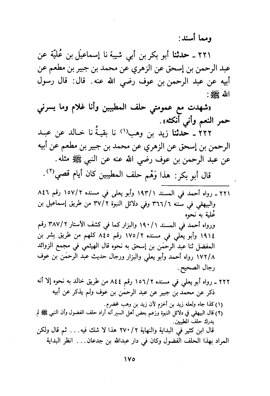 221 - حَدَّثَنَا أَبُو بَكْرِ بْنُ أَبِي شَيْبَةَ، نا إِسْمَاعِيلُ ابْنُ عُلَيَّةَ، عَنْ عَبْدِ الرَّحْمَنِ بْنِ إِسْحَاقَ، عَنِ الزُّهْرِيِّ، عَنْ مُحَمَّدِ بْنِ جُبَيْرِ بْنِ مُطْعِمٍ، عَنْ أَبِيهِ، عَنْ عَبْدِ الرَّحْمَنِ بْنِ عَوْفٍ رَضِيَ اللَّهُ عَنْهُ، قَالَ: قَالَ رَسُولُ اللَّهِ صَلَّى اللهُ عَلَيْهِ وَسَلَّمَ: «§شَهِدْتُ مَعَ عُمُومَتِي حِلْفَ الْمُطَيَّبِينَ وَأَنَا غُلَامٌ وَمَا يَسُرُّنِي حُمُرُ النَّعَمِ وَأَنِّي أَنْكُثُهُ»