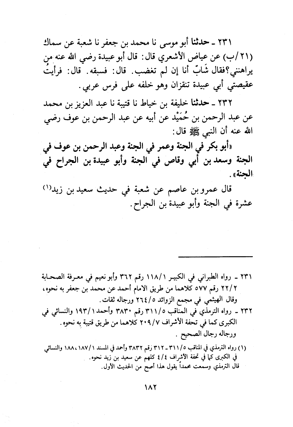 232 - حَدَّثَنَا خَلِيفَةُ بْنُ خَيَّاطٍ، نا قُتَيْبَةُ، نا عَبْدُ الْعَزِيزِ بْنُ مُحَمَّدٍ، عَنْ عَبْدِ الرَّحْمَنِ بْنِ حُمَيْدٍ، عَنْ أَبِيهِ، عَنْ عَبْدِ الرَّحْمَنِ بْنِ عَوْفٍ رَضِيَ اللَّهُ عَنْهُ، أَنَّ النَّبِيَّ صَلَّى اللهُ عَلَيْهِ وَسَلَّمَ قَالَ: «§أَبُو بَكْرٍ فِي الْجَنَّةِ، وَعُمَرُ فِي الْجَنَّةِ، وَعَبْدُ الرَّحْمَنِ بْنُ عَوْفٍ فِي الْجَنَّةِ، وَسَعْدُ بْنُ أَبِي وَقَّاصٍ فِي الْجَنَّةِ، وَأَبُو عُبَيْدَةَ بْنُ الْجَرَّاحِ فِي الْجَنَّةِ» قَالَ عَمْرُو بْنُ عَاصِمٍ، عَنْ شُعْبَةَ فِي حَدِيثِ سَعِيدِ بْنِ زَيْدٍ: عَشْرَةٌ فِي الْجَنَّةِ وَأَبُو عُبَيْدَةَ بْنُ الْجَرَّاحِ