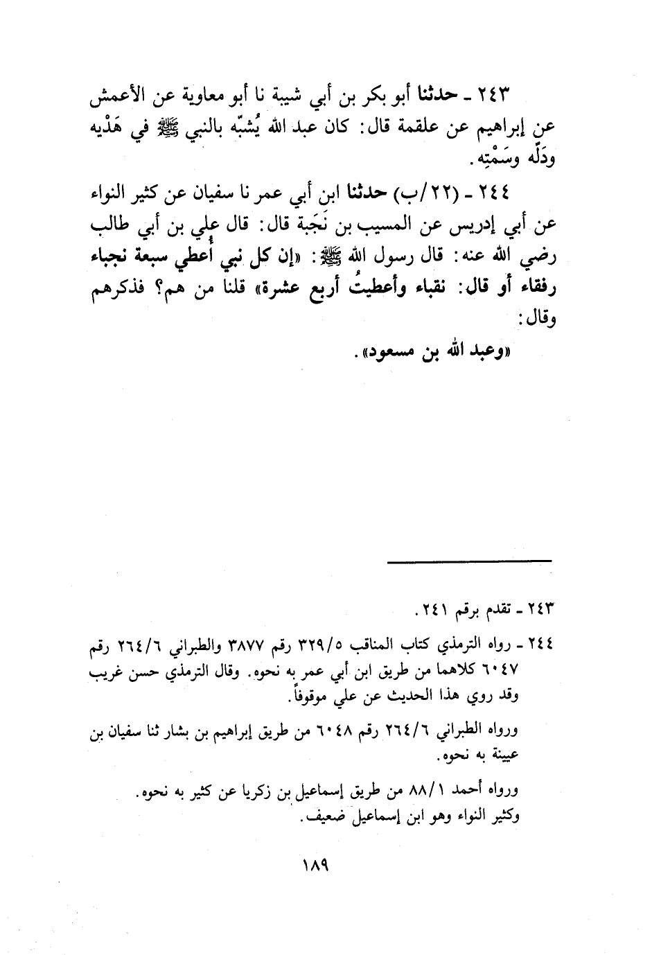 243 - حَدَّثَنَا أَبُو بَكْرِ بْنُ أَبِي شَيْبَةَ، نا أَبُو مُعَاوِيَةَ، عَنِ الْأَعْمَشِ، عَنْ إِبْرَاهِيمَ، عَنْ عَلْقَمَةَ، قَالَ: «كَانَ عَبْدُ اللَّهِ §يُشَبَّهُ بِالنَّبِيِّ صَلَّى اللهُ عَلَيْهِ وَسَلَّمَ فِي هَدْيِهِ وَدَلِّهِ وَسَمْتِهِ؟»