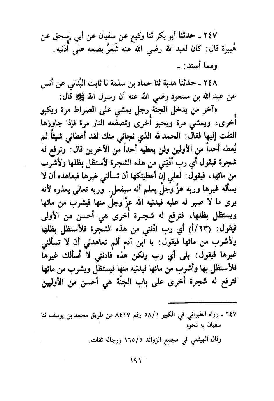 248 - حَدَّثَنَا هُدْبَةُ، ثنا حَمَّادُ بْنُ سَلَمَةَ، نا ثَابِتٌ الْبُنَانِيُّ، عَنْ أَنَسٍ، عَنْ عَبْدِ اللَّهِ بْنِ مَسْعُودٍ رَضِيَ اللَّهُ عَنْهُ، أَنَّ رَسُولَ اللَّهِ صَلَّى اللهُ عَلَيْهِ وَسَلَّمَ قَالَ: " §آخِرُ مَنْ يَدْخُلُ الْجَنَّةَ رَجُلٌ يَمْشِي عَلَى الصِّرَاطِ مَرَّةً، وَيَكْبُو أُخْرَى، وَيَمْشِي مَرَّةً وَيَحْبُو أُخْرَى، وَتَصْفَعُهُ النَّارُ مَرَّةً فَإِذَا جَاوَزَهَا الْتَفَتَ إِلَيْهَا فَقَالَ: الْحَمْدُ لِلَّهِ الَّذِي نَجَّانِي مِنْكِ لَقَدْ أَعْطَانِي شَيْئًا لَمْ يُعْطَهُ أَحَدٌ مِنَ الْأَوَّلِينَ، وَلَنْ يُعْطِيَهُ أَحَدًا مِنَ الْآخِرِينَ. قَالَ: وَتُرْفَعُ لَهُ شَجَرَةٌ فَيَقُولُ: أَيْ رَبِّ، أَدْنِنِي مِنْ هَذِهِ الشَّجَرَةِ لِأَسْتَظِلَّ بِظِلِّهَا وَلِأَشْرَبَ مِنْ مَائِهَا، فَيَقُولُ لَعَلِّي إِنْ أَعْطَيْتُكَهَا أَنْ تَسْأَلَنِي غَيْرَهَا؟ فَيُعَاهِدُهُ أَنْ لَا يَسْأَلَهُ غَيْرَهَا وَرَبُّهُ عَزَّ وَجَلَّ يَعْلَمُ أَنَّهُ سَيَفْعَلُ وَرَبُّهُ تَعَالَى يَعْذِرُهُ لِأَنَّهُ يَرَى مَا لَا صَبْرَ لَهُ عَلَيْهِ فَيُدْنِيهِ اللَّهُ عَزَّ وَجَلَّ مِنْهَا فَيَشْرَبُ مِنْ مَائِهَا وَيَسْتَظِلُّ بِظِلِّهَا، فَتُرْفَعُ لَهُ شَجَرَةٌ أُخْرَى هِيَ أَحْسَنُ مِنَ الْأُولَى فَيَقُولُ: أَيْ رَبِّ، أَدْنِنِي مِنْ هَذِهِ الشَّجَرَةِ فَلْأَسْتَظِلَّ بِظِلِّهَا وَلْأَشْرَبْ مِنْ مَائِهَا فَيَقُولُ: يَا ابْنَ آدَمَ، أَلَمْ تُعَاهِدْنِي أَنْ لَا تَسْأَلَنِي غَيْرَهَا فَيَقُولُ: بَلَى أَيْ رَبِّ، وَلَكِنْ هَذِهِ فَأَدْنِنِي لَا أَسْأَلُكَ غَيْرَهَا فَلْأَسْتَظِلَّ بِهَا وَأَشْرَبْ مِنْ مَائِهَا. فَيُدْنِيهِ مِنْهَا فَيَسْتَظِلُّ وَيَشْرَبُ مِنْ مَائِهَا فَتُرْفَعُ لَهُ شَجَرَةٌ أُخْرَى عَلَى بَابِ الْجَنَّةِ هِيَ أَحْسَنُ مِنَ الْأُولَيَيْنِ -[192]- فَيَقُولُ: أَدْنِنِي مِنْ هَذِهِ فَلْأَسْتَظِلَّ بِظِلِّهَا وَلْأَشْرَبْ مِنْ مَائِهَا. فَيَقُولُ: يَا ابْنَ آدَمَ أَلَمْ تُعَاهِدْنِي أَنْ لَا تَسْأَلَنِي غَيْرَهَا فَيَقُولُ: بَلَى يَا رَبِّ، وَلَكِنْ هَذِهِ فَلْأَسْتَظِلَّ بِظِلِّهَا وَأَشْرَبْ مِنْ مَائِهَا لَا أَسْأَلُكَ غَيْرَهَا فَيُعَاهِدُهُ أَنْ لَا يَسْأَلَهُ غَيْرَهَا، وَرَبُّهُ عَزَّ وَجَلَّ يَعْلَمُ أَنَّهُ سَيَسْأَلُهُ غَيْرَهَا وَرَبُّهُ تَعَالَى يَعْذِرُهُ لِأَنَّهُ يَرَى مَا لَا صَبْرَ لَهُ عَلَيْهِ، فَيُدْنِيهِ اللَّهُ تَعَالَى مِنْهَا فَيَسْمَعُ أَصْوَاتَ أَهْلِ الْجَنَّةِ فَيَقُولُ: يَا رَبِّ أَدْخِلْنِي الْجَنَّةَ يَا رَبِّ أَدْخِلْنِي الْجَنَّةَ لَا أَسْأَلُكَ غَيْرَهَا. فَيَقُولُ: يَا ابْنَ آدَمَ، أَيُرْضِيكَ أَنْ أُعْطِيَكَ مِثْلَ الدُّنْيَا وَمِثْلَهَا مَعَهَا فَيَقُولُ: أَيْ رَبِّ أَتَسْتَهْزِئُ بِي وَأَنْتَ رَبُّ الْعَالَمِينَ " فَيَضْحَكُ ابْنُ مَسْعُودٍ رَضِيَ اللَّهُ عَنْهُ، وَقَالَ: أَلَا تَسْأَلُونِي مِمَّا ضَحِكْتُ؟ قَالُوا: وَمِمَّ ضَحِكْتُ؟ فَقَالَ: هَكَذَا فَعَلَ رَسُولُ اللَّهِ صَلَّى اللهُ عَلَيْهِ وَسَلَّمَ فَقَالَ: «أَلَا تَسْأَلُونِي مِمَّ أَضْحَكُ؟» قَالُوا: وَمِمَّ تَضْحَكُ يَا رَسُولَ اللَّهِ؟ قَالَ: «مِنْ ضَحِكِ رَبِّ الْعَالَمِينَ» ، فَيَقُولُ: «إِنِّي لَا أَسْتَهْزِئُ مِنْكَ وَلَكِنِّي عَلَى مَا أَشَاءُ قَدِيرٌ»