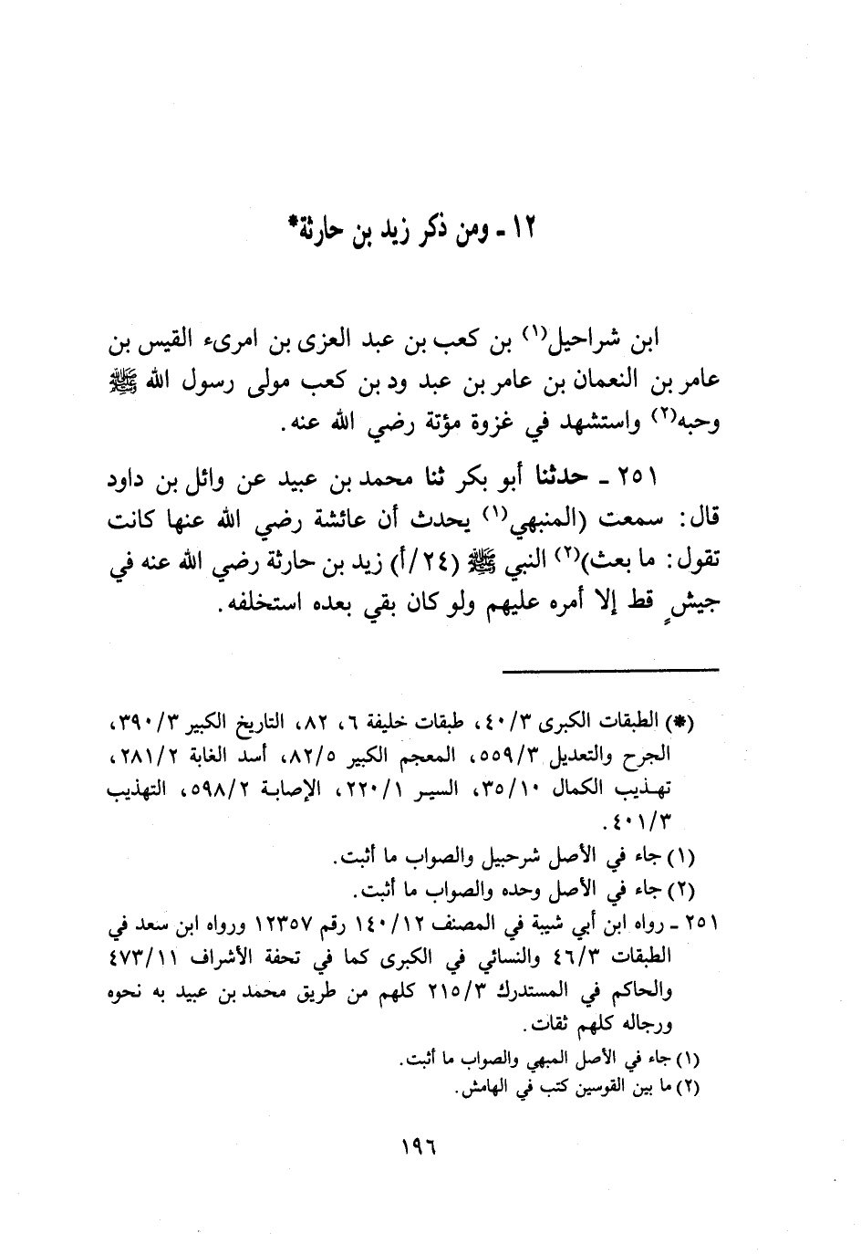 §وَمِنْ ذِكْرِ زَيْدِ بْنِ حَارِثَةَ بْنِ شَرَاحِيلَ بْنِ كَعْبِ بْنِ عَبْدِ الْعُزَّى بْنِ امْرِئِ الْقَيْسِ بْنِ عَامِرِ بْنِ النُّعْمَانِ بْنِ عَامِرِ بْنِ عَبْدِ وُدِّ بْنِ كَعْبٍ. مَوْلَى رَسُولِ اللَّهِ صَلَّى اللهُ عَلَيْهِ وَسَلَّمَ وَحِبِّهِ، وَاسْتُشْهِدَ فِي غَزْوَةِ مُؤْتَةَ رَضِيَ اللَّهُ عَنْهُ