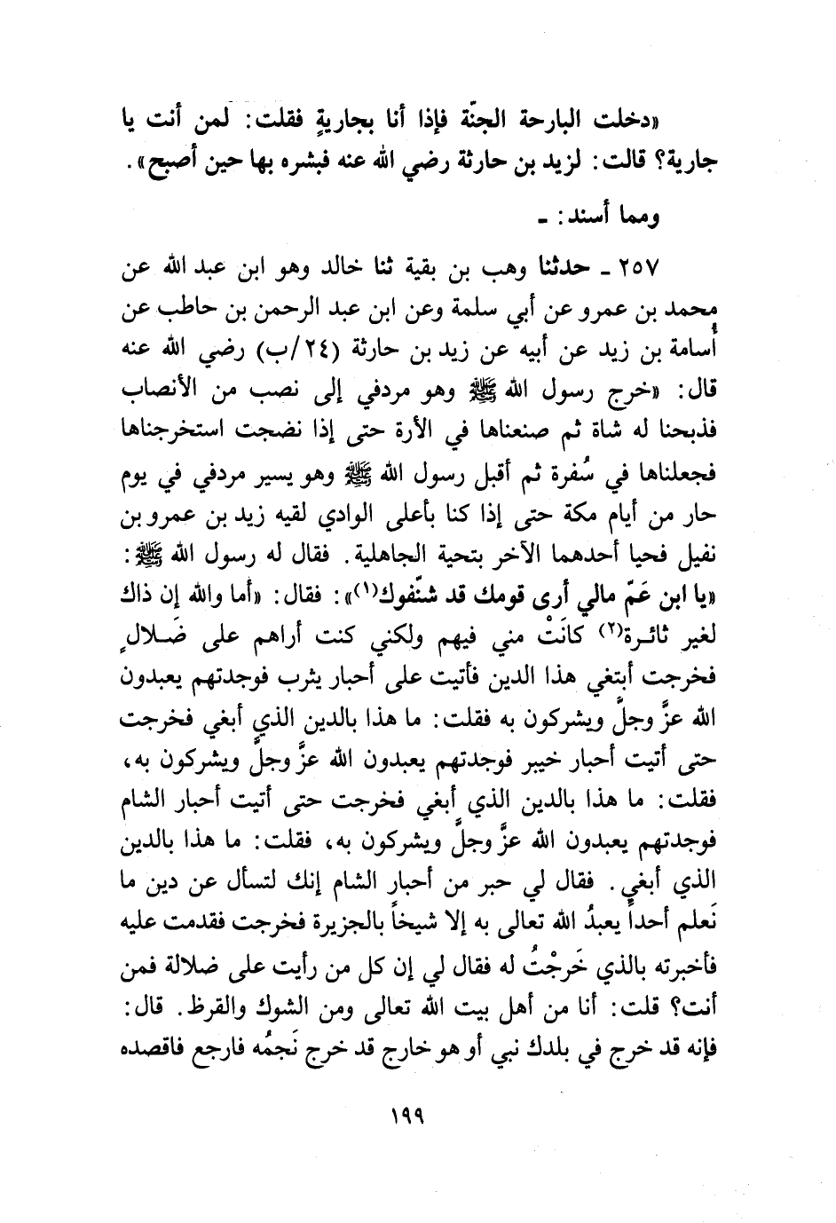 257 - حَدَّثَنَا وَهْبُ بْنُ بَقِيَّةَ، ثنا خَالِدٌ وَهُوَ ابْنُ عَبْدِ اللَّهِ، عَنْ مُحَمَّدِ بْنِ عَمْرٍو، عَنْ أَبِي سَلَمَةَ، وَعَنِ ابْنِ أَبِي عَبْدِ الرَّحْمَنِ بْنِ حَاطِبٍ، عَنْ أُسَامَةَ بْنِ زَيْدٍ، عَنْ أَبِيهِ، عَنْ زَيْدِ بْنِ حَارِثَةَ رَضِيَ اللَّهُ عَنْهُ، قَالَ: خَرَجَ رَسُولُ اللَّهِ صَلَّى اللهُ عَلَيْهِ وَسَلَّمَ وَهُوَ مُرْدِفِي إِلَى نُصُبٍ مِنَ الْأَنْصَابِ فَذَبَحْنَا لَهُ شَاةً ثُمَّ صَنَعْنَاهَا فِي الْأرَةِ حَتَّى إِذَا نَضِجَتِ اسْتَخْرَجْنَاهَا فَجَعَلْنَاهَا فِي سُفْرَةٍ، ثُمَّ أَقْبَلَ رَسُولُ اللَّهِ صَلَّى اللهُ عَلَيْهِ وَسَلَّمَ، وَهُوَ يَسِيرُ مُرْدِفِي فِي يَوْمٍ حَارٍّ مِنْ أَيَّامِ مَكَّةَ حَتَّى إِذَا كُنَّا بِأَعْلَى الْوَادِي لُقِيَهُ زَيْدُ بْنُ عَمْرِو بْنِ نُفَيْلٍ، فَحَيَّا أَحَدُهُمَا الْآخَرَ بِتَحِيَّةِ الْجَاهِلِيَّةِ، فَقَالَ لَهُ رَسُولُ اللَّهِ صَلَّى اللهُ عَلَيْهِ وَسَلَّمَ: «يَا ابْنَ عَمِّ، §مَالِي أَرَى قَوْمَكَ قَدْ شَنَّفُوكَ؟» فَقَالَ: أَمَا وَاللَّهِ إِنَّ ذَاكَ لِغَيْرِ ثَائِرَةٍ كَانَتْ مِنِّي فِيهِمْ، وَلَكِنِّي كُنْتُ أَرَاهُمْ عَلَى ضَلَالٍ فَخَرَجْتُ أَبْتَغِي هَذَا الدِّينَ فَأَتَيْتُ عَلَى أَحْبَارِ يَثْرِبَ فَوَجَدْتُهُمْ يَعْبُدُونَ اللَّهَ عَزَّ وَجَلَّ وَيُشْرِكُونَ بِهِ، فَقُلْتُ: مَا هَذَا بِالدَّيْنِ الَّذِي أَبْغِي فَخَرَجْتُ حَتَّى أَتَيْتُ أَحْبَارَ خَيْبَرَ فَوَجَدْتُهُمْ يَعْبُدُونَ اللَّهَ عَزَّ وَجَلَّ وَيُشْرِكُونَ بِهِ، فَقُلْتُ: مَا هَذَا بِالدَّيْنِ الَّذِي أَبْغِي، فَخَرَجْتُ حَتَّى أَتَيْتُ أَحْبَارَ الشَّامِ فَوَجَدْتُهُمْ يَعْبُدُونَ اللَّهَ عَزَّ وَجَلَّ وَيُشْرِكُونَ بِهِ، فَقُلْتُ: مَا هَذَا بِالدَّيْنِ الَّذِي أَبْغِي. فَقَالَ لِي: حَبْرٌ مِنْ أَحْبَارِ الشَّامِ: إِنَّكَ لَتَسْأَلُ عَنْ دِينٍ مَا نَعْلَمُ أَحَدًا يُعْبُدُ اللَّهَ تَعَالَى بِهِ إِلَّا شَيْخًا بِالْجَزِيرَةِ، فَخَرَجْتُ فَقَدِمْتُ عَلَيْهِ فَأَخْبَرْتُهُ بِالَّذِي خَرَجْتُ لَهُ، فَقَالَ لِي: إِنَّ كُلَّ مَنْ رَأَيْتُ عَلَى ضَلَالَةٍ فَمَنْ أَنْتَ؟ قُلْتُ: أَنَا مِنْ أَهْلِ بَيْتِ اللَّهِ تَعَالَى وَمِنَ الشَّوْكِ وَالْقَرَظِ. قَالَ: فَإِنَّهُ قَدْ خَرَجَ فِي بَلَدِكَ نَبِيٌّ أَوْ هُوَ خَارِجٌ قَدْ خَرَجَ نَجْمُهُ فَارْجِعْ فَاقْصِدْهُ -[200]- وَاتَّبِعْهُ وَآمِنْ بِهِ، فَرَحَلْتُ فَلَمْ أُخْبِرْ بِشَيْءٍ فَقَدَّمْنَا إِلَيْهِ السُّفْرَةَ فَقَالَ: مَا هَذَا؟ فَقُلْنَا: ذَبَحْنَاهَا لِنُصُبٍ مِنَ الْأَنْصَابِ