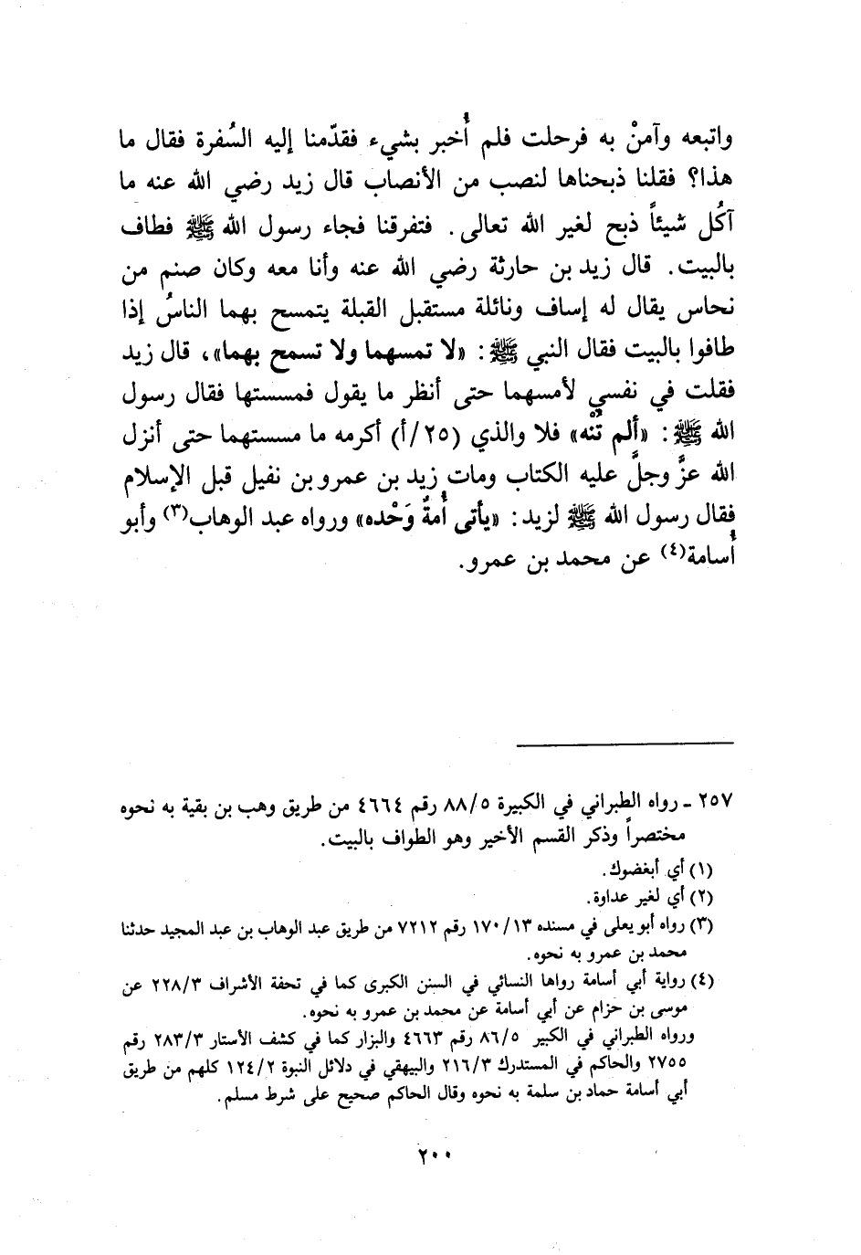قَالَ زَيْدٌ رَضِيَ اللَّهُ عَنْهُ: مَا آكُلُ شَيْئًا ذُبَحَ لِغَيْرِ اللَّهِ تَعَالَى. فَتَفَرَّقْنَا فَجَاءَ رَسُولُ اللَّهِ صَلَّى اللهُ عَلَيْهِ وَسَلَّمَ، فَطَافَ بِالْبَيْتِ، قَالَ زَيْدُ بْنُ حَارِثَةَ رَضِيَ اللَّهُ عَنْهُ: وَأَنَا مَعَهُ وَكَانَ صَنَمٌ مِنْ نُحَاسٍ يُقَالُ لَهُ: إِسَافٌ وَنَائِلَةٌ مُسْتَقْبِلَ الْقِبْلَةِ يَتَمَسَّحُ بِهِمَا النَّاسَ، إِذَا طَافُوا بِالْبَيْتِ، فَقَالَ النَّبِيُّ صَلَّى اللهُ عَلَيْهِ وَسَلَّمَ: «§لَا تَمَسَّهُمَا وَلَا تَمَسَّحْ بِهِمَا» . قَالَ زَيْدٌ: فَقُلْتُ: فِي نَفْسِي لَأَمَسُّهُمَا حَتَّى أَنْظُرَ مَا يَقُولُ، فَمَسَسْتُهَا فَقَالَ رَسُولُ اللَّهِ صَلَّى اللهُ عَلَيْهِ وَسَلَّمَ: «أَلَمْ تُنْهَ؟» فَلَا وَالَّذِي أَكْرَمَهُ مَا مَسَسْتُهُمَا حَتَّى أَنْزَلَ اللَّهُ عَزَّ وَجَلَّ عَلَيْهِ الْكِتَابَ وَمَاتَ زَيْدُ بْنُ عَمْرِو بْنِ نُفَيْلٍ قَبْلَ الْإِسْلَامِ، فَقَالَ رَسُولُ اللَّهِ صَلَّى اللهُ عَلَيْهِ وَسَلَّمَ لِزَيْدٍ: «يَأْتِي أُمَّةً وَحْدَهُ» وَرَوَاهُ عَبْدُ الْوَهَّابِ، وَأَبُو أُسَامَةَ، عَنْ مُحَمَّدِ بْنِ عَمْرٍو