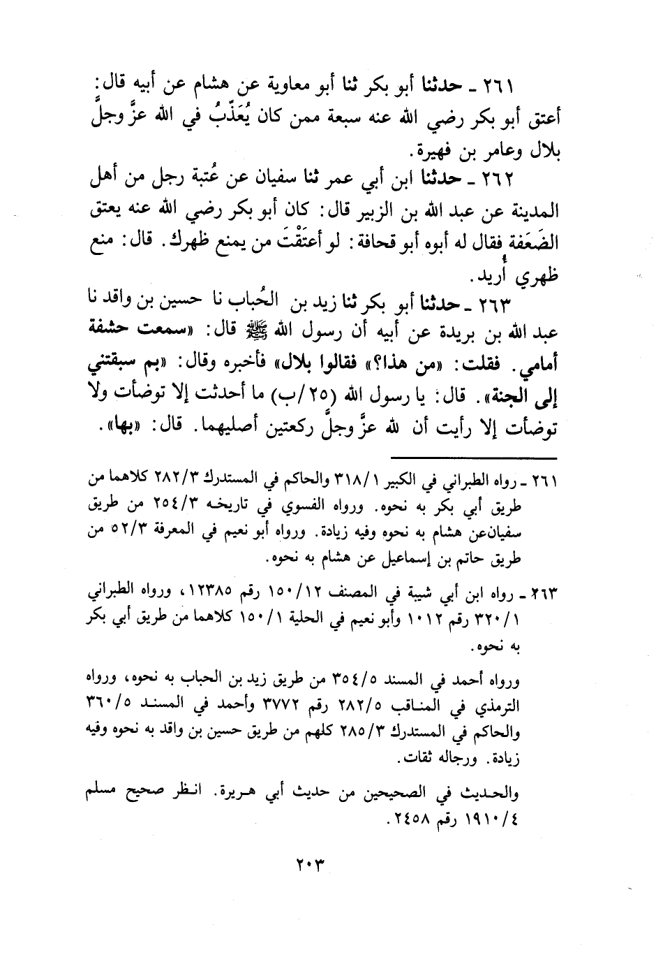 263 - حَدَّثَنَا أَبُو بَكْرٍ، ثنا زَيْدُ بْنُ الْحُبَابِ، نا حُسَيْنُ بْنُ وَاقِدٍ، نا عَبْدُ اللَّهِ بْنُ بُرَيْدَةَ، عَنْ أَبِيهِ، أَنَّ رَسُولَ اللَّهِ صَلَّى اللهُ عَلَيْهِ وَسَلَّمَ، قَالَ: سَمِعْتُ حَشَفَةً أَمَامِي فَقُلْتُ: مَنْ هَذَا؟ فَقَالُوا: بِلَالٌ، فَأَخْبَرَهُ وَقَالَ: «§بِمَ سَبَقْتَنِي إِلَى الْجَنَّةِ؟» قَالَ: يَا رَسُولَ اللَّهِ، مَا أَحْدَثْتُ إِلَّا تَوَضَّأْتُ وَلَا تَوَضَّأْتُ إِلَّا رَأَيْتُ أَنَّ لِلَّهِ عَزَّ وَجَلَّ رَكْعَتَيْنِ أُصَلِّيهِمَا. قَالَ: «بِهَا» وَمِمَّا أَسْنَدَ