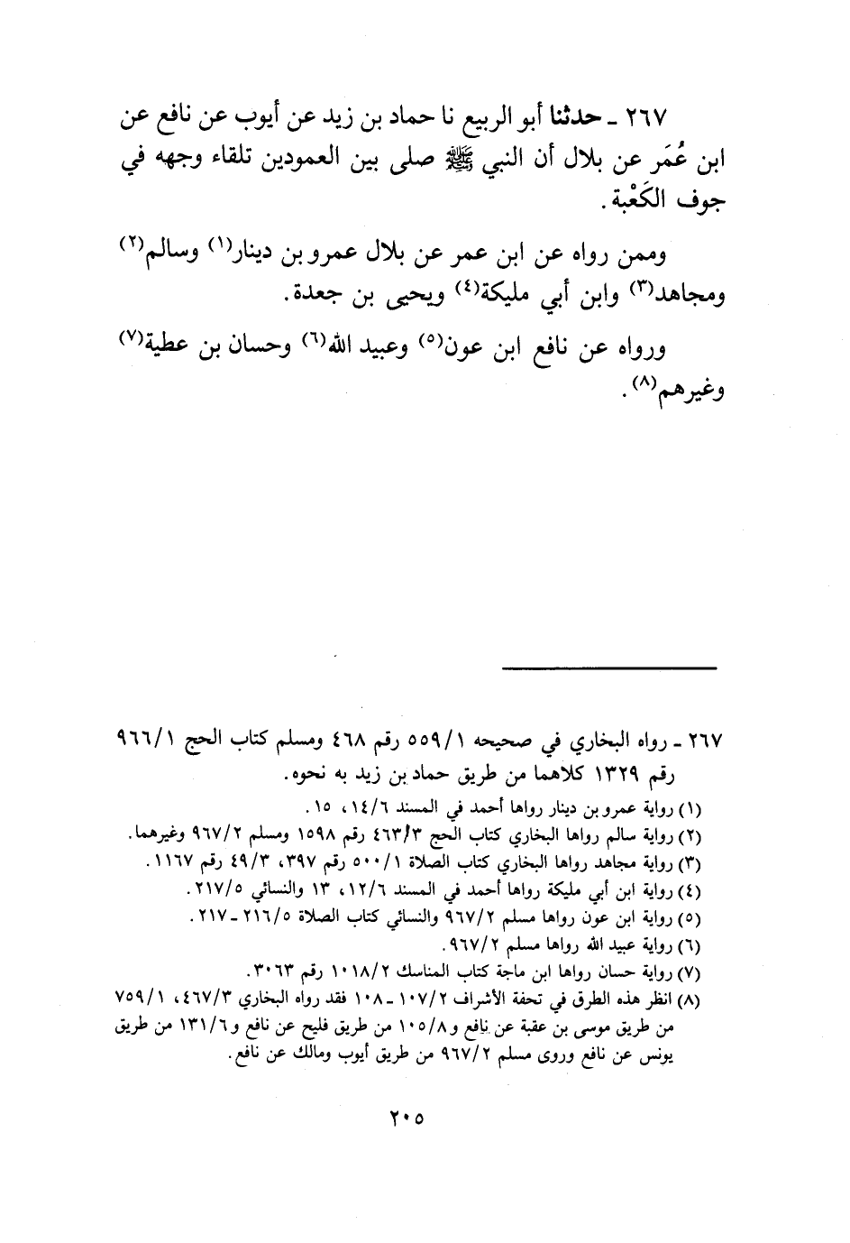 267 - حَدَّثَنَا أَبُو الرَّبِيعِ، نا حَمَّادُ بْنُ زَيْدٍ، عَنْ أَيُّوبَ، عَنْ نَافِعٍ، عَنِ ابْنِ عُمَرَ، عَنْ بِلَالٍ: «أَنَّ النَّبِيَّ صَلَّى اللهُ عَلَيْهِ وَسَلَّمَ §صَلَّى بَيْنَ الْعَمُودَيْنِ تِلْقَاءَ وَجْهِهِ فِي جَوْفِ الْكَعْبَةِ» وَمِمَّنْ رَوَاهُ عَنِ ابْنِ عُمَرَ، عَنْ بِلَالٍ، عَمْرُو بْنُ دِينَارٍ، وَسَالِمٌ، وَمُجَاهِدٌ، وَابْنُ أَبِي مُلَيْكَةَ، وَيَحْيَى بْنُ جَعْدَةَ، رَوَاهُ عَنْ نَافِعِ بْنِ عَوْنٍ، وَعُبَيْدِ اللَّهِ، وَحَسَّانَ بْنِ عَطِيَّةِ، وَغَيْرِهِمْ
