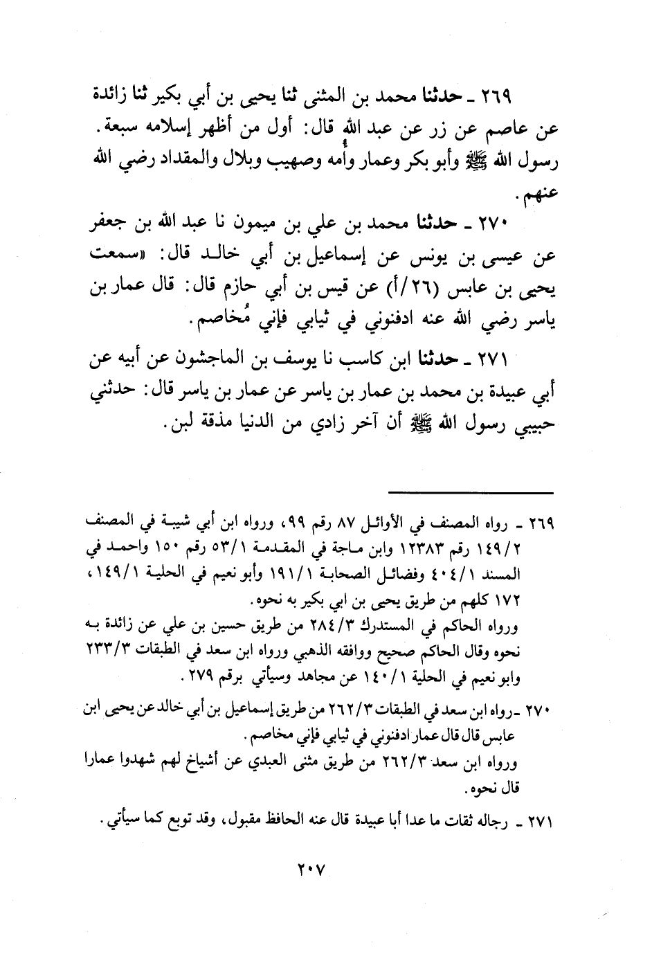 269 - حَدَّثَنَا مُحَمَّدُ بْنُ الْمُثَنَّى، ثنا يَحْيَى بْنُ أَبِي بُكَيْرٍ، ثنا زَائِدَةُ، عَنْ عَاصِمٍ، عَنْ زِرٍّ، عَنْ عَبْدِ اللَّهِ، قَالَ: " §أَوَّلُ مَنْ أَظْهَرَ إِسْلَامَهُ سَبْعَةٌ: رَسُولُ اللَّهِ صَلَّى اللهُ عَلَيْهِ وَسَلَّمَ، وَأَبُو بَكْرٍ، وَعَمَّارٌ، وَأُمُّهُ، وَصُهَيْبٌ، وَبِلَالٌ، وَالْمِقْدَادُ رَضِيَ اللهُ عَنْهُمْ "