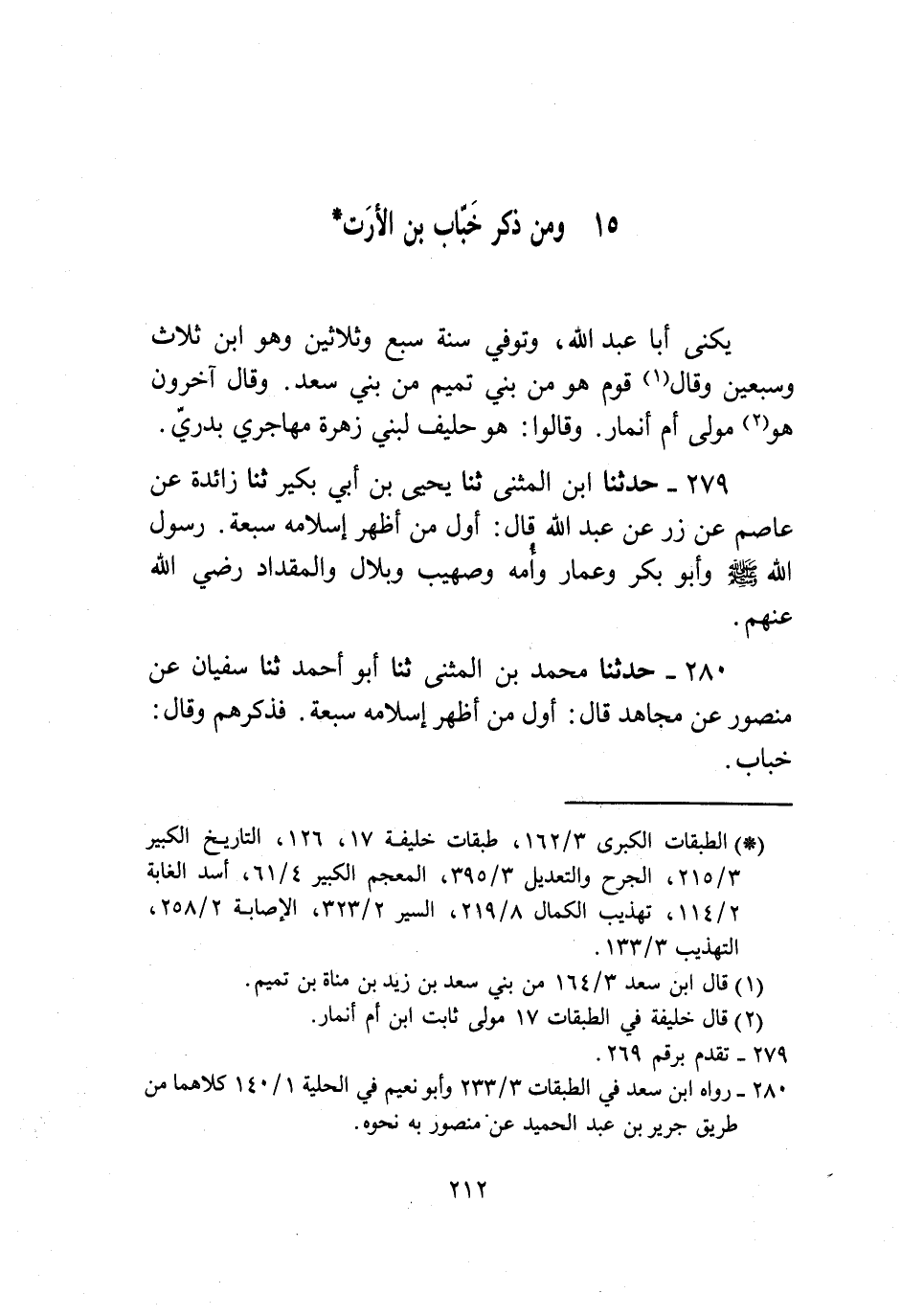 §وَمِنْ ذِكْرِ خَبَّابِ بْنِ الْأَرَتِّ يُكْنَى أَبَا عَبْدِ اللَّهِ. وَتُوُفِّيَ سَنَةَ سَبْعٍ وَثَلَاثِينَ، وَهُوَ ابْنُ ثَلَاثٍ وَسَبْعِينَ، وَقَالَ قَوْمٌ: هُوَ مِنْ بَنِي تَمِيمٍ، مِنْ بَنِي سَعْدٍ، وَقَالَ آخَرُونَ: هُوَ مَوْلَى أُمِّ أَنْمَارٍ. وَقَالُوا: هُوَ حَلِيفٌ لِبَنِي زُهْرَةَ مُهَاجِرِيٌّ بَدْرِيٌّ