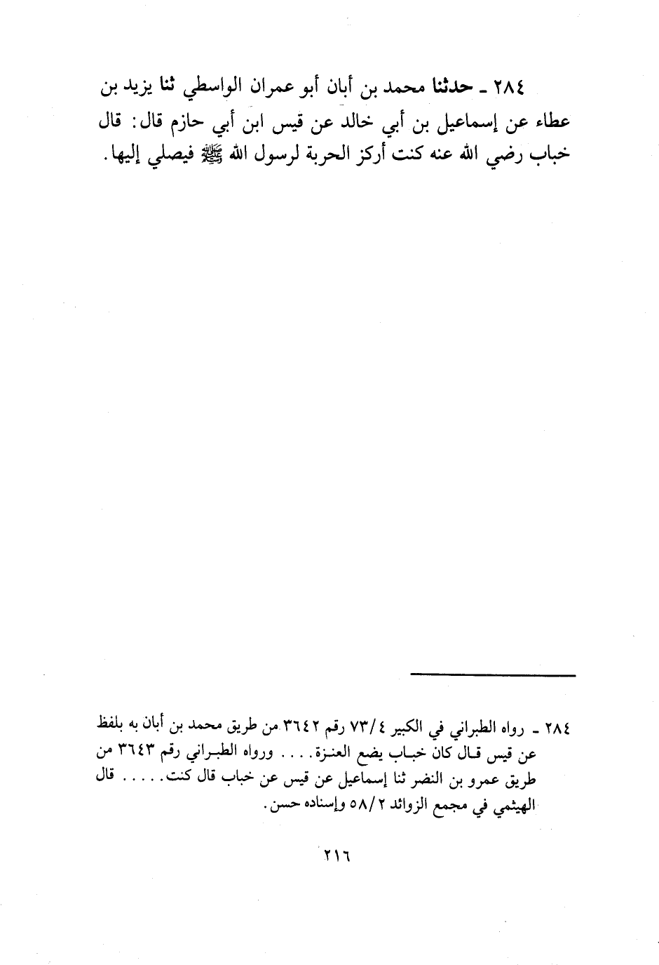 284 - حَدَّثَنَا مُحَمَّدُ بْنُ أَبَانَ أَبُو عِمْرَانَ الْوَاسِطِيُّ، ثنا يَزِيدُ بْنُ عَطَاءٍ، عَنْ إِسْمَاعِيلَ بْنِ أَبِي خَالِدٍ، عَنْ قَيْسِ بْنِ أَبِي حَازِمٍ، قَالَ: قَالَ خَبَّابٌ رَضِيَ اللَّهُ عَنْهُ: «كُنْتُ §أَرْكَزُ الْحَرْبَةَ لِرَسُولِ اللَّهِ صَلَّى اللهُ عَلَيْهِ وَسَلَّمَ، فَيُصَلِّي إِلَيْهَا»