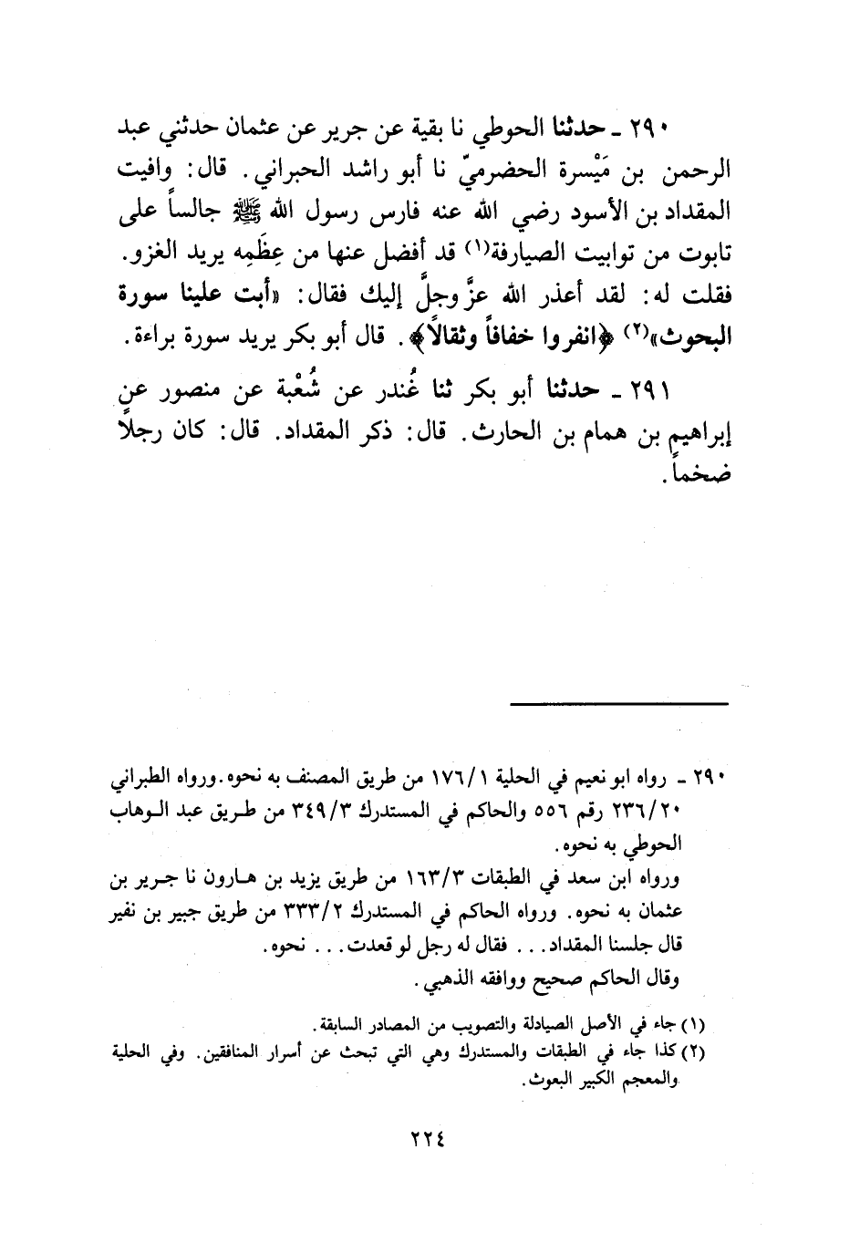 290 - حَدَّثَنَا الْحَوْطِيُّ، نا بَقِيَّةُ، عَنْ جَرِيرٍ، عَنْ عُثْمَانَ، حَدَّثَنِي عَبْدُ الرَّحْمَنِ بْنُ مَيْسَرَةَ الْحَضْرَمِيُّ، نا أَبُو رَاشِدٍ الْحُبْرَانِيُّ، قَالَ: وَافَيْتُ الْمِقْدَادَ بْنَ الْأَسْوَدِ رَضِيَ اللَّهُ عَنْهُ، فَارِسَ رَسُولِ اللَّهِ صَلَّى اللهُ عَلَيْهِ وَسَلَّمَ، جَالِسًا عَلَى تَابُوتٍ مِنْ تَوَابِيتِ الصَّيَارِفَةِ قَدْ أَفْضَلَ عَنْهَا مِنْ عَظْمِهِ يُرِيدُ الْغَزْوَ فَقُلْتُ لَهُ: لَقَدْ أَعْذَرَ اللَّهُ عَزَّ وَجَلَّ إِلَيْكَ. فَقَالَ: " أَبَتْ عَلَيْنَا سُورَةُ الْبَحُوثِ {§انْفِرُوا خِفَافًا وَثِقَالًا} [التوبة: 41] " قَالَ أَبُو بَكْرٍ: يُرِيدُ سُورَةَ بَرَاءَةَ