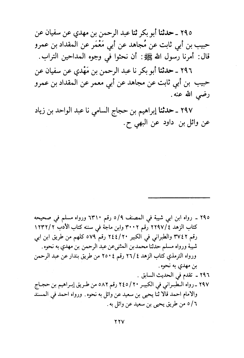 295 - حَدَّثَنَا أَبُو بَكْرٍ، ثنا عَبْدُ الرَّحْمَنِ بْنُ مَهْدِيٍّ، عَنْ سُفْيَانَ، عَنْ حَبِيبِ بْنِ أَبِي ثَابِتٍ، عَنْ مُجَاهِدٍ، عَنْ أَبِي مَعْمَرٍ، عَنِ الْمِقْدَادِ بْنِ عَمْرٍو، قَالَ: «§أَمَرَنَا رَسُولُ اللَّهِ صَلَّى اللهُ عَلَيْهِ وَسَلَّمَ، أَنْ نَحْثُوَا فِي وُجُوهِ الْمَدَّاحِينَ التُّرَابَ»