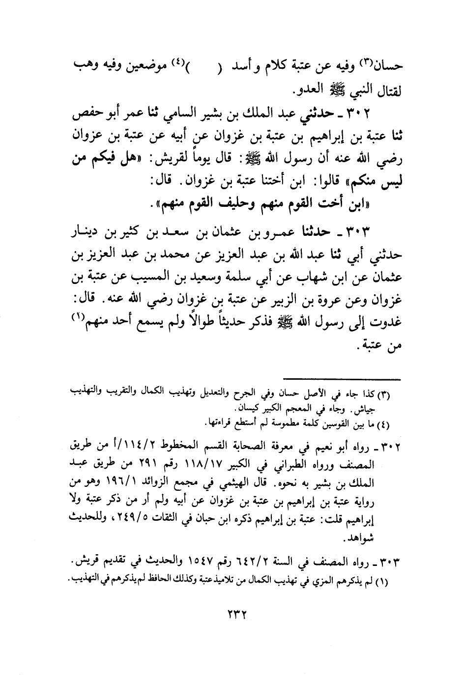 302 - حَدَّثَنِي عَبْدُ الْمَلِكِ بْنُ بَشِيرٍ السَّامِيُّ، ثنا عُمَرُ أَبُو حَفْصٍ، ثنا عُتْبَةُ بْنُ إِبْرَاهِيمَ بْنِ عُتْبَةَ بْنِ غَزْوَانَ، عَنْ أَبِيهِ، عَنْ عُتْبَةَ بْنِ غَزْوَانَ رَضِيَ اللَّهُ عَنْهُ، أَنَّ رَسُولَ اللَّهِ صَلَّى اللهُ عَلَيْهِ وَسَلَّمَ، قَالَ يَوْمًا لِقُرَيْشٍ: «§هَلْ فِيكُمْ مَنْ لَيْسَ مِنْكُمْ؟» قَالُوا: ابْنُ أُخْتِنَا عُتْبَةُ بْنُ غَزْوَانَ. قَالَ: «ابْنُ أُخْتِ الْقَوْمِ مِنْهُمْ وَحَلِيفُ الْقَوْمِ مِنْهُمْ»