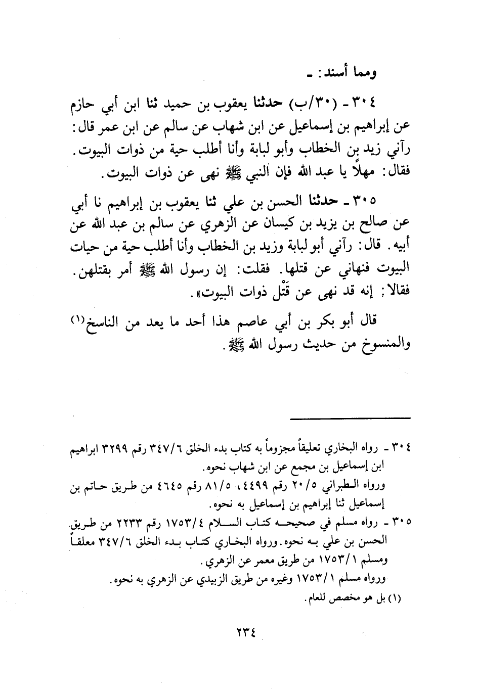 305 - حَدَّثَنَا الْحَسَنُ بْنُ عَلِيٍّ، ثنا يَعْقُوبُ بْنُ إِبْرَاهِيمَ، نا أَبِي، عَنْ صَالِحِ بْنِ يَزِيدَ بْنِ كَيْسَانَ، عَنِ الزُّهْرِيِّ، عَنْ سَالِمِ بْنِ عَبْدِ اللَّهِ، عَنْ أَبِيهِ، قَالَ: رَآنِي أَبُو لُبَابَةَ، وَزِيدُ بْنُ الْخَطَّابِ، وَأَنَا أَطْلُبُ حَيَّةً مِنْ حَيَّاتِ الْبُيُوتِ، فَنَهَانِي عَنْ قَتْلِهَا، فَقُلْتُ: " إِنَّ رَسُولَ اللَّهِ صَلَّى اللهُ عَلَيْهِ وَسَلَّمَ أَمَرَ بِقَتْلِهِنَّ فَقَالَا: «إِنَّهُ قَدْ §نَهَى عَنْ قَتْلِ ذَوَاتِ الْبُيُوتِ» قَالَ أَبُو بَكْرِ بْنُ أَبِي عَاصِمٍ: هَذَا أَحَدُ مَا يُعَدُّ مِنَ النَّاسِخِ وَالْمَنْسُوخِ مِنْ حَدِيثِ رَسُولِ اللَّهِ صَلَّى اللهُ عَلَيْهِ وَسَلَّمَ