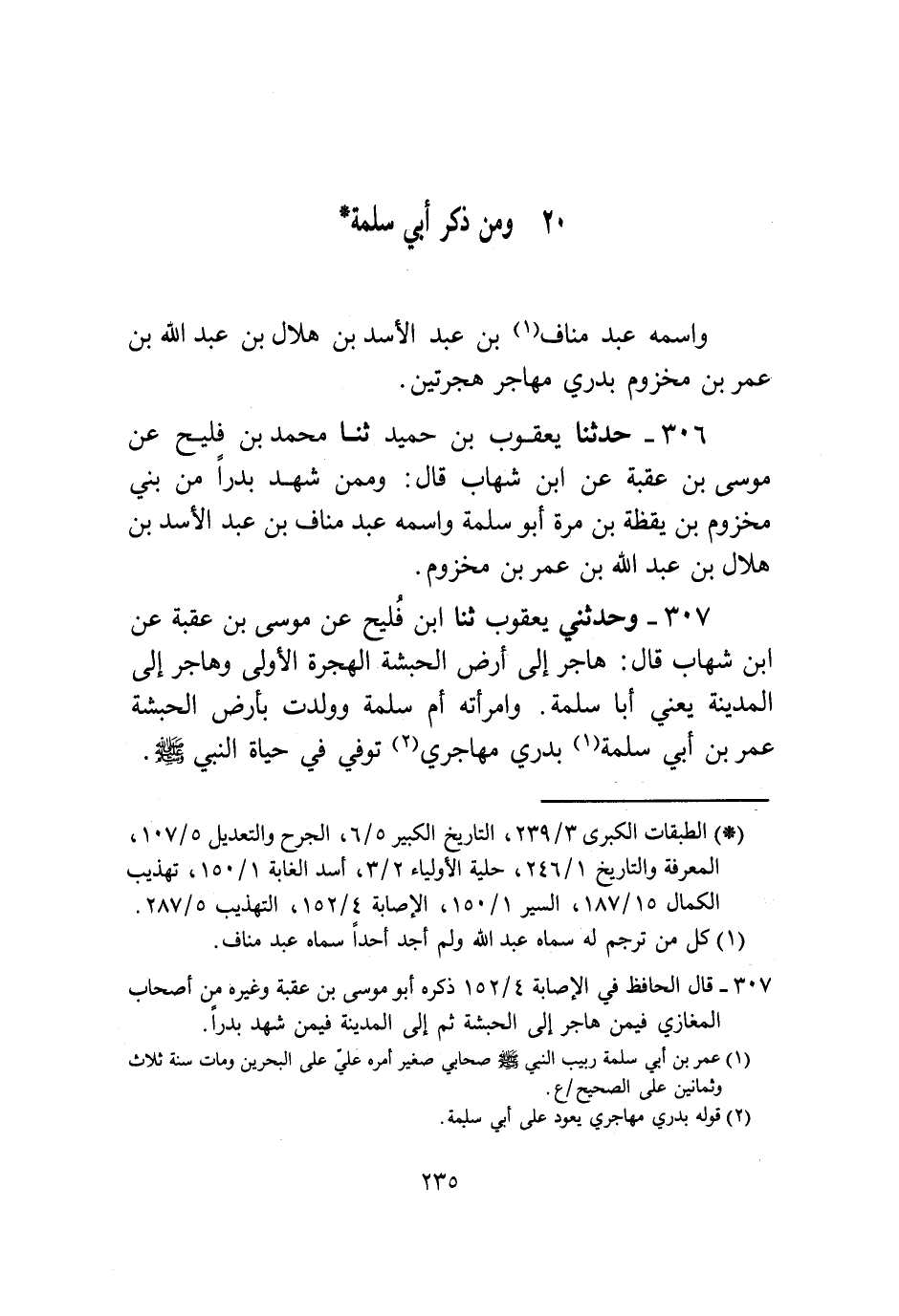 307 - وَحَدَّثَنِي يَعْقُوبُ، ثنا ابْنُ فُلَيْحٍ، عَنْ مُوسَى بْنِ عُقْبَةَ، عَنِ ابْنِ شِهَابٍ، قَالَ: «§هَاجَرَ إِلَى أَرْضِ الْحَبَشَةِ الْهِجْرَةَ الْأُولَى، وَهَاجَرَ إِلَى الْمَدِينَةِ - يَعْنِي أَبَا سَلَمَةَ - وَامْرَأَتُهُ أُمُّ سَلَمَةَ، وَوَلَدَتْ بِأَرْضِ الْحَبَشَةِ عُمَرَ بْنَ أَبِي سَلَمَةَ بَدْرِيٌّ مُهَاجِرِيٌّ تُوُفِّيَ فِي حَيَاةِ النَّبِيِّ صَلَّى اللهُ عَلَيْهِ وَسَلَّمَ»