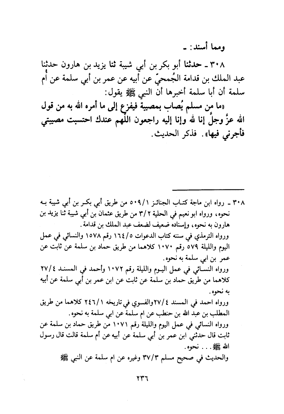 308 - حَدَّثَنَا أَبُو بَكْرِ بْنُ أَبِي شَيْبَةَ، ثنا يَزِيدُ بْنُ هَارُونَ، حَدَّثَنَا عَبْدُ الْمَلِكِ بْنُ قُدَامَةَ الْجُمَحِيُّ، عَنْ أَبِيهِ، عَنْ عُمَرَ بْنِ أَبِي سَلَمَةَ، عَنْ أُمِّ سَلَمَةَ، أَنَّ أَبَا سَلَمَةَ، أَخْبَرَهَا أَنَّ النَّبِيَّ صَلَّى اللهُ عَلَيْهِ وَسَلَّمَ يَقُولُ: " §مَا مِنْ مُسْلِمٍ يُصَابُ بِمُصِيبَةٍ فَيَفْزَعُ إِلَى مَا أَمَرَهُ اللَّهُ بِهِ مِنْ قَوْلِ اللَّهِ عَزَّ وَجَلَّ: إِنَّا لِلَّهِ وَإِنَّا إِلَيْهِ رَاجِعُونَ، اللَّهُمَّ عِنْدَكَ احْتَسَبْتُ مُصِيبَتِي فَأْجُرْنِي فِيهَا " فَذَكَرَ الْحَدِيثَ