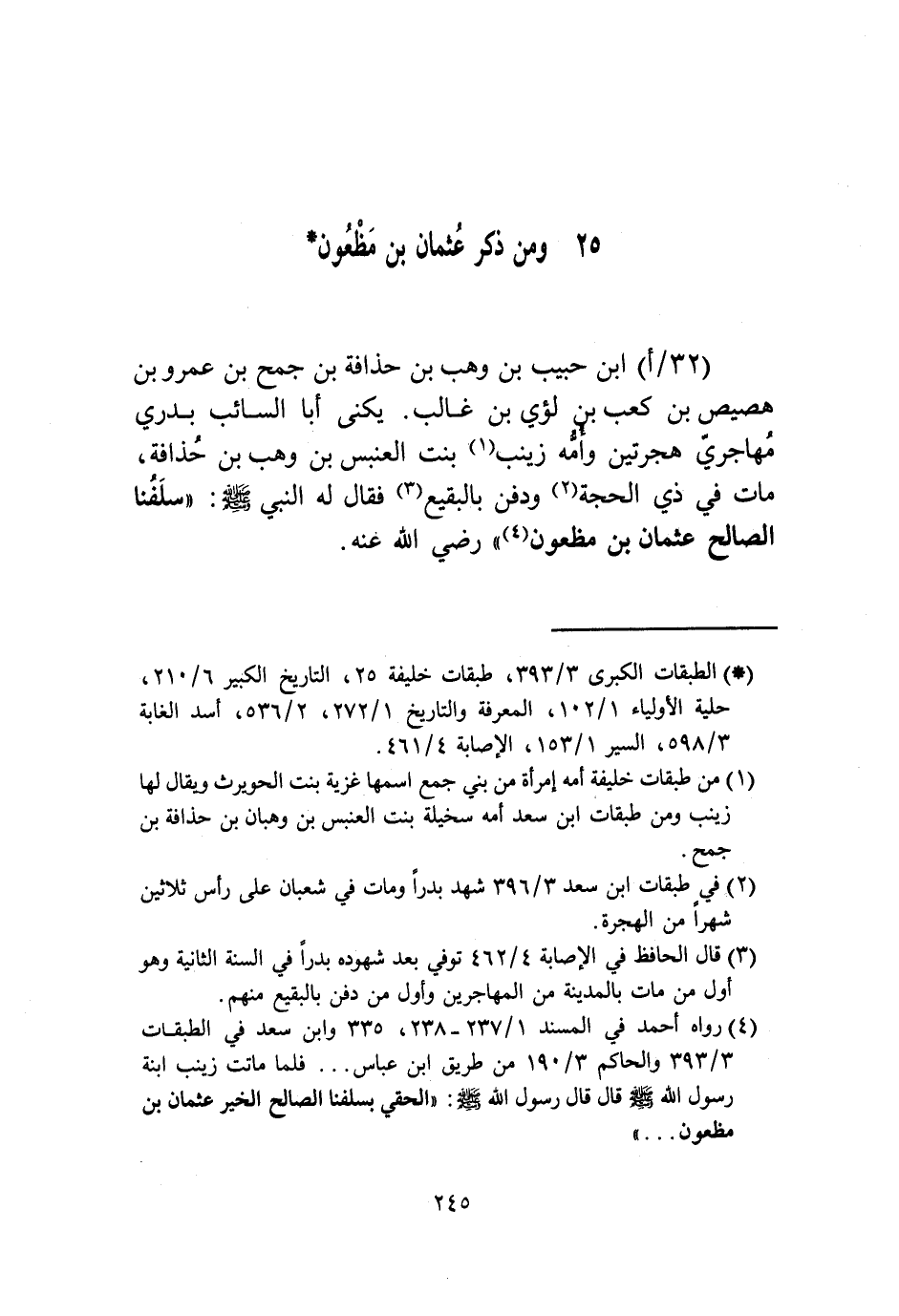 §وَمِنْ ذِكْرِ عُثْمَانَ بْنِ مَظْعُونِ بْنِ حَبِيبِ بْنِ وَهْبِ بْنِ حُذَافَةَ بْنِ جُمَحَ بْنِ عَمْرِو بْنِ هُصَيْصِ بْنِ كَعْبِ بْنِ لُؤَيِّ بْنِ غَالِبٍ يُكْنَى أَبَا السَّائِبِ، بَدْرِيٌّ مُهَاجِرٌ هِجْرَتَيْنِ، وَأُمُّهُ زَيْنَبُ بِنْتُ الْعَنْبَسِ بْنِ وَهْبِ بْنِ حُذَافَةَ، مَاتَ فِي ذِي الْحِجَّةِ وَدُفِنَ بِالْبَقِيعِ، فَقَالَ لَهُ النَّبِيُّ صَلَّى اللهُ عَلَيْهِ وَسَلَّمَ: «سَلَفُنَا الصَّالِحُ عُثْمَانُ بْنُ مَظْعُونٍ رَضِيَ اللَّهُ عَنْهُ»