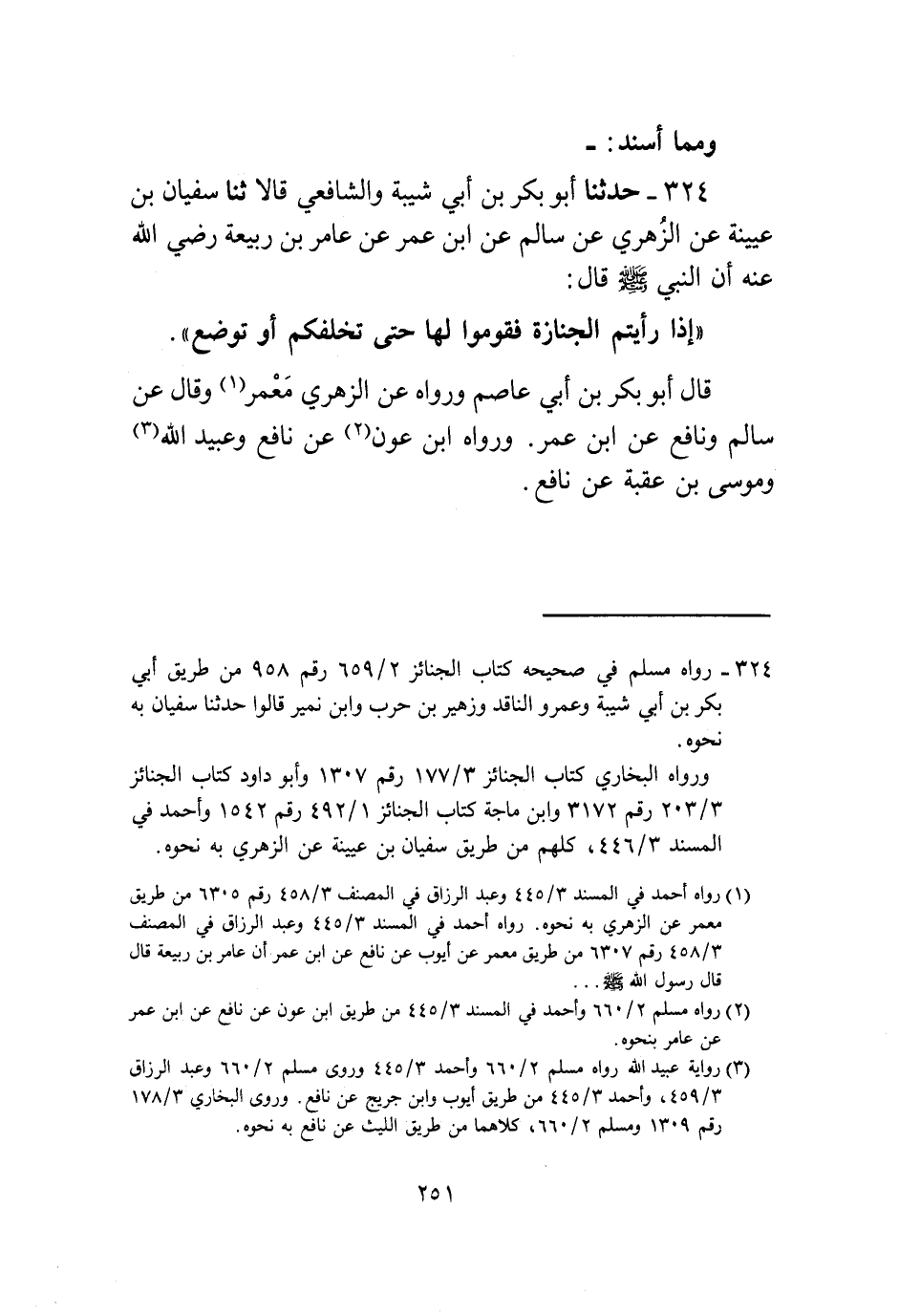 324 - حَدَّثَنَا أَبُو بَكْرِ بْنُ أَبِي شَيْبَةَ، وَالشَّافِعِيُّ، قَالَا: ثنا سُفْيَانُ بْنُ عُيَيْنَةَ، عَنِ الزُّهْرِيِّ، عَنْ سَالِمٍ، عَنِ ابْنِ عُمَرَ، عَنْ عَامِرِ بْنِ رَبِيعَةَ رَضِيَ اللَّهُ عَنْهُ، أَنَّ النَّبِيَّ صَلَّى اللهُ عَلَيْهِ وَسَلَّمَ قَالَ: «§إِذَا رَأَيْتُمُ الْجَنَازَةَ فَقُومُوا لَهَا حَتَّى تُخَلِّفَكُمْ أَوْ تُوضَعَ» ، قَالَ أَبُو بَكْرِ بْنُ أَبِي عَاصِمٍ: وَرَوَاهُ عَنِ الزُّهْرِيِّ، مَعْمَرٌ، وَقَالَ عَنْ سَالِمٍ، وَنَافِعٍ، عَنِ ابْنِ عُمَرَ، وَرَوَاهُ ابْنُ عَوْنٍ، عَنْ نَافِعٍ، وَعُبَيْدُ اللَّهِ، وَمُوسَى بْنُ عُقْبَةَ، عَنْ نَافِعٍ