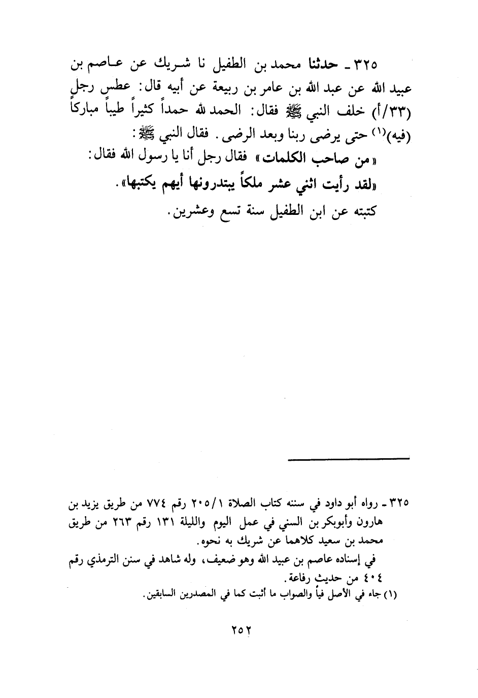 325 - حَدَّثَنَا مُحَمَّدُ بْنُ الطُّفَيْلِ، نا شَرِيكٌ، عَنْ عَاصِمِ بْنِ عُبَيْدِ اللَّهِ، عَنْ عَبْدِ اللَّهِ بْنِ عَامِرِ بْنِ رَبِيعَةَ، عَنْ أَبِيهِ، قَالَ: عَطَسَ رَجُلٌ خَلْفَ النَّبِيِّ صَلَّى اللهُ عَلَيْهِ وَسَلَّمَ، فَقَالَ: §الْحَمْدُ لِلَّهِ حَمْدًا كَثِيرًا طَيِّبًا مُبَارَكًا فِيهِ حَتَّى يَرْضى رَبُّنَا وَبَعْدَ الرِّضَى. فَقَالَ النَّبِيُّ صَلَّى اللهُ عَلَيْهِ وَسَلَّمَ: «مَنْ صَاحِبُ الْكَلِمَاتِ؟» فَقَالَ رَجُلٌ: أَنَا يَا رَسُولَ اللَّهِ. فَقَالَ: «لَقَدْ رَأَيْتُ اثْنَيْ عَشَرَ مَلَكًا يَبْتَدِرُونَهَا أَيُّهُمْ يَكْتُبُهَا» كَتَبَهُ عَنِ ابْنِ الطُّفَيْلِ سَنَةَ تِسْعٍ وَعِشْرِينَ