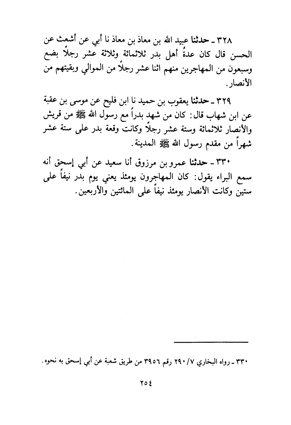 328 - حَدَّثَنَا عُبَيْدُ اللَّهِ بْنُ مُعَاذِ بْنِ مُعَاذٍ، نا أَبِي، عَنْ أَشْعَثَ، عَنِ الْحَسَنِ، قَالَ: «كَانَ §عِدَّةُ أَهْلِ بَدْرٍ ثَلَاثَمِائَةٍ وَثَلَاثَةَ عَشَرَ رَجُلًا، بِضْعٌ وَسَبْعُونَ مِنَ الْمُهَاجِرِينَ، مِنْهُمُ اثَنَا عَشَرَ رَجُلًا مِنَ الْمَوَالِي وَبَقِيَّتُهُمْ مِنَ الْأَنْصَارِ»