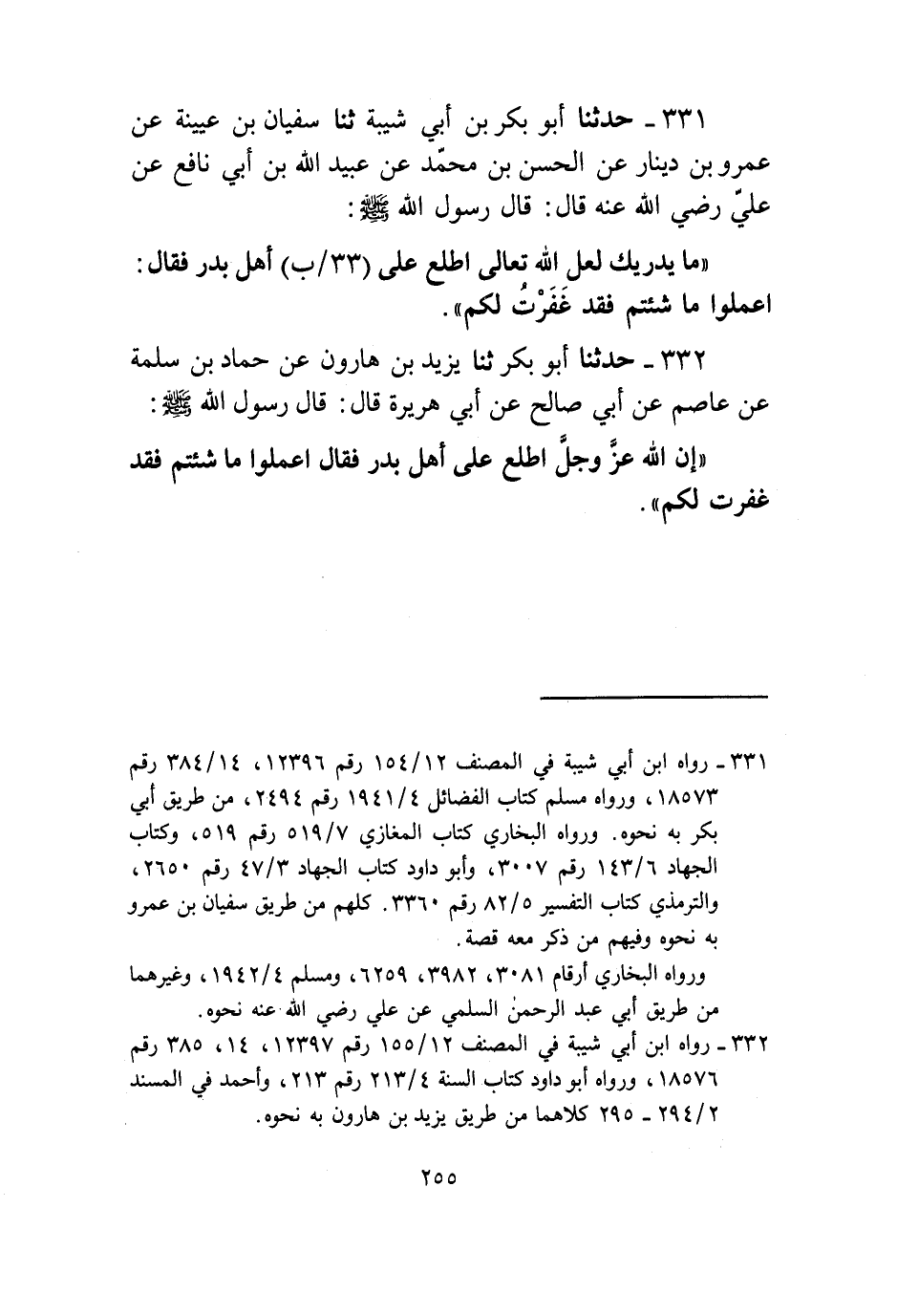 331 - حَدَّثَنَا أَبُو بَكْرِ بْنُ أَبِي شَيْبَةَ، ثنا سُفْيَانُ بْنُ عُيَيْنَةَ، عَنْ عَمْرِو بْنِ دِينَارٍ، عَنِ الْحَسَنِ بْنِ مُحَمَّدٍ، عَنْ عُبَيْدِ اللَّهِ بْنِ أَبِي نَافِعٍ، عَنْ عَلِيٍّ رَضِيَ اللَّهُ عَنْهُ، قَالَ: قَالَ رَسُولُ اللَّهِ صَلَّى اللهُ عَلَيْهِ وَسَلَّمَ: " §مَا يُدْرِيكَ؟ لَعَلَّ اللَّهَ تَعَالَى اطَّلَعَ عَلَى أَهْلِ بَدْرٍ فَقَالَ: اعْلَمُوا مَا شِئْتُمْ فَقَدْ غَفَرْتُ لَكُمْ "