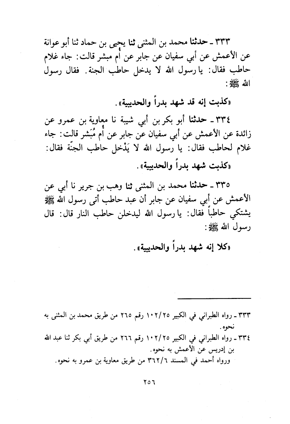 333 - حَدَّثَنَا مُحَمَّدُ بْنُ الْمُثَنَّى، ثنا يَحْيَى بْنُ حَمَّادٍ، ثنا أَبُو عَوَانَةَ، عَنِ الْأَعْمَشِ، عَنْ أَبِي سُفْيَانَ، عَنْ جَابِرٍ، عَنْ أُمِّ مُبَشِّرٍ، قَالَتْ: جَاءَ غُلَامُ حَاطِبٍ، فَقَالَ: يَا رَسُولَ اللَّهِ، لَا يَدْخُلُ حَاطِبُ الْجَنَّةَ، فَقَالَ رَسُولُ اللَّهِ صَلَّى اللهُ عَلَيْهِ وَسَلَّمَ: «§كَذَبْتَ إِنَّهُ قَدْ شَهِدَ بَدْرًا وَالْحُدَيْبِيَةَ»