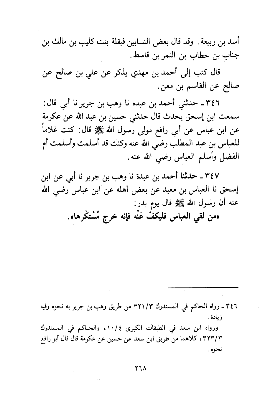347 - حَدَّثَنَا أَحْمَدُ بْنُ عَبْدَةَ، نا وَهْبُ بْنُ جَرِيرٍ، نا أَبِي، عَنِ ابْنِ إِسْحَاقَ، نا الْعَبَّاسُ بْنُ مَعْبَدٍ، عَنْ بَعْضِ أَهْلِهِ، عَنِ ابْنِ عَبَّاسٍ رَضِيَ اللَّهُ عَنْهُ، أَنَّ رَسُولَ اللَّهِ صَلَّى اللهُ عَلَيْهِ وَسَلَّمَ، قَالَ يَوْمَ بَدْرٍ: «§مَنْ لَقِيَ الْعَبَّاسَ فَلْيَكُفَّ عَنْهُ، فَإِنَّهُ خَرَجَ مُسْتَكْرَهًا»