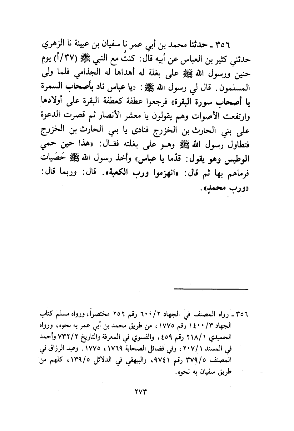 356 - حَدَّثَنَا مُحَمَّدُ بْنُ أَبِي عُمَرَ، نا سُفْيَانُ بْنُ عُيَيْنَةَ، نا الزُّهْرِيُّ، حَدَّثَنِي كَثِيرُ بْنُ الْعَبَّاسِ، عَنْ أَبِيهِ، قَالَ: كُنْتُ مَعَ النَّبِيِّ صَلَّى اللهُ عَلَيْهِ وَسَلَّمَ، يَوْمَ حُنَيْنٍ، رَسُولُ اللَّهِ صَلَّى اللهُ عَلَيْهِ وَسَلَّمَ عَلَى بَغْلَةٍ لَهُ أَهْدَاهَا لَهُ الْجُذَامِيُّ، فَلَمَّا وَلَّى الْمُسْلِمُونَ، قَالَ لِي رَسُولُ اللَّهِ صَلَّى اللهُ عَلَيْهِ وَسَلَّمَ: «يَا عَبَّاسُ، §نَادِ بِأَصْحَابِ السَّمُرَةِ يَا أَصْحَابَ سُورَةِ الْبَقَرَةِ» فَرَجَعُوا عَطْفَةً كَعَطْفَةِ الْبَقَرَةِ عَلَى أَوْلَادِهَا، وَارْتَفَعَتِ الْأَصْوَاتُ وَهُمْ يَقُولُونَ: يَا مَعْشَرَ الْأَنْصَارِ، ثُمَّ قُصِرَتِ الدَّعْوَةُ عَلَى بَنِي الْحَارِثِ بْنِ الْخَزْرَجِ فَنَادَى: يَا بَنِي الْحَارِثِ بْنِ الْخَزْرَجِ، فَتَطَاوَلَ رَسُولُ اللَّهِ صَلَّى اللهُ عَلَيْهِ وَسَلَّمَ وَهُوَ عَلَى بَغْلَتِهِ، فَقَالَ: «هَذَا حِينَ حَمِيَ الْوَطِيسُ» وَهُوَ يَقُولُ: «قُدُمًا يَا عَبَّاسُ» وَأَخَذَ رَسُولُ اللَّهِ صَلَّى اللهُ عَلَيْهِ وَسَلَّمَ، حَصَيَاتٍ فَرَمَاهُمْ بِهَا ثُمَّ قَالَ: «انْهَزَمُوا وَرَبِّ الْكَعْبَةِ» قَالَ: وَرُبَّمَا قَالَ: «وَرَبِّ مُحَمَّدٍ»