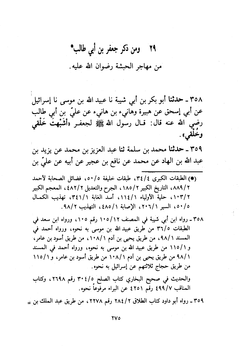 358 - حَدَّثَنَا أَبُو بَكْرِ بْنُ أَبِي شَيْبَةَ، نا عُبَيْدُ اللَّهِ بْنُ مُوسَى، نا إِسْرَائِيلُ، عَنْ أَبِي إِسْحَاقَ، عَنْ هُبَيْرَةَ، وَهَانِئِ بْنِ هَانِئٍ، عَنْ عَلِيِّ بْنِ أَبِي طَالِبٍ رَضِيَ اللَّهُ عَنْهُ، قَالَ: قَالَ رَسُولُ اللَّهِ صَلَّى اللهُ عَلَيْهِ وَسَلَّمَ لِجَعْفَرٍ: «§أَشْبَهْتَ خَلْقِي وَخُلُقِي»