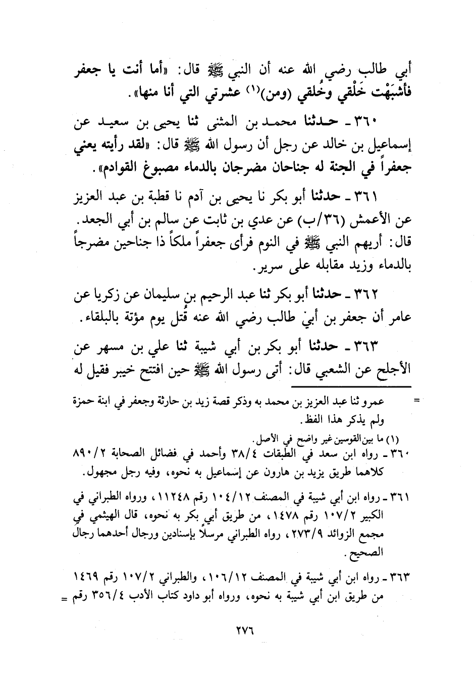 360 - حَدَّثَنَا مُحَمَّدُ بْنُ الْمُثَنَّى، ثنا يَحْيَى بْنُ سَعِيدٍ، عَنْ إِسْمَاعِيلَ بْنِ خَالِدٍ، عَنْ رَجُلٍ، أَنَّ رَسُولَ اللَّهِ صَلَّى اللهُ عَلَيْهِ وَسَلَّمَ قَالَ: " §لَقَدْ رَأَيْتُهُ - يَعْنِي: جَعْفَرًا - فِي الْجَنَّةِ لَهُ جَنَاحَانِ مُضَرَّجَانِ بِالدِّمَاءِ، مَصْبُوغُ الْقَوَادِمِ "