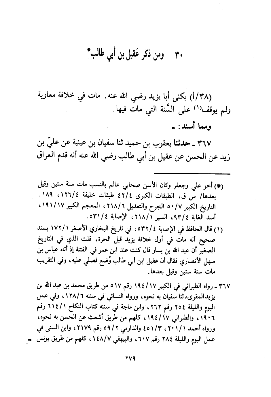 §وَمِنْ ذِكْرِ عَقِيلِ بْنِ أَبِي طَالِبٍ يُكْنَى أَبَا يَزِيدَ رَضِيَ اللَّهُ عَنْهُ، مَاتَ فِي خِلَافَةِ مُعَاوِيَةَ وَلَمْ يُوقَفْ عَلَى السَّنَةِ الَّتِي مَاتَ فِيهَا