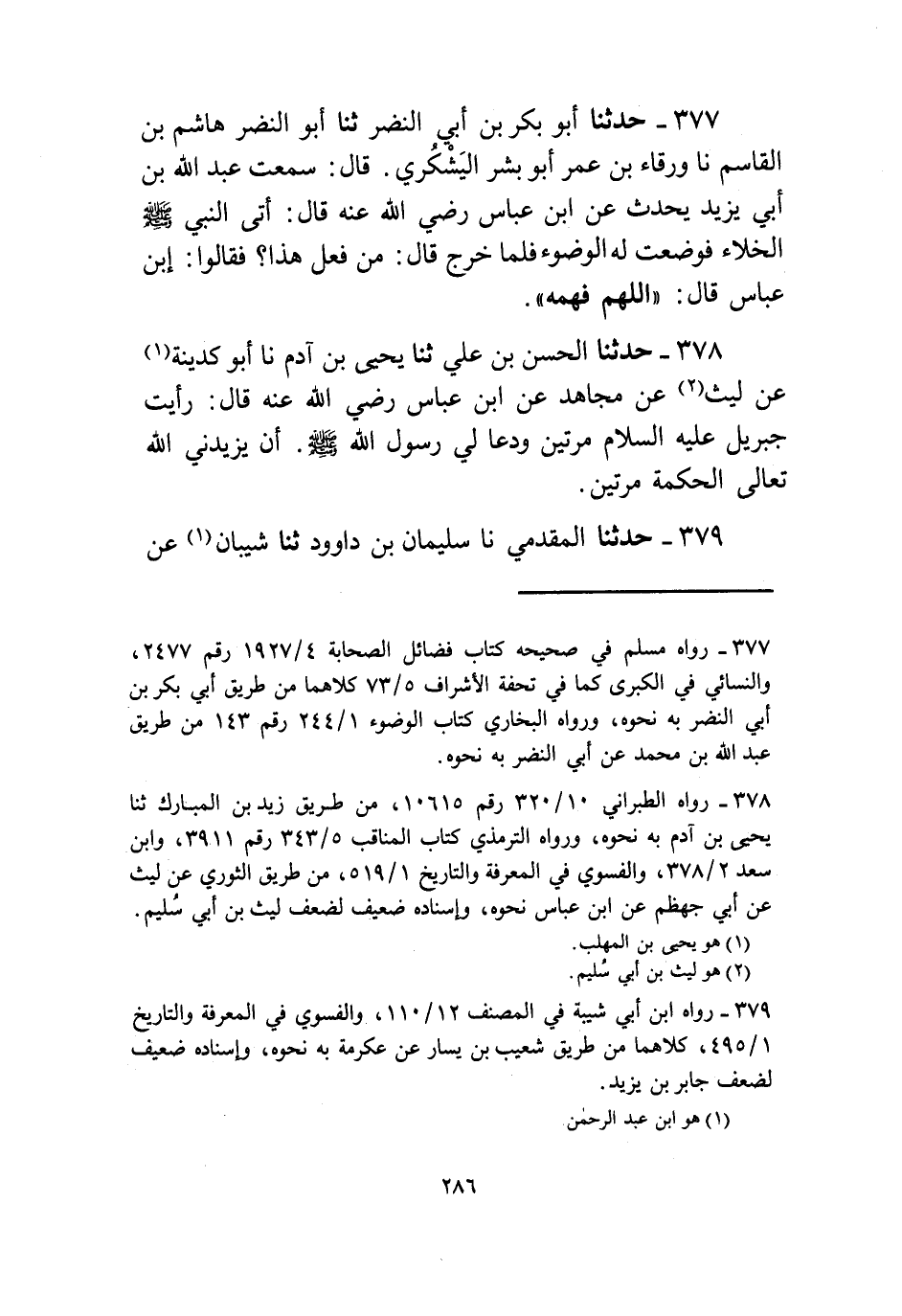 377 - حَدَّثَنَا أَبُو بَكْرِ بْنُ أَبِي النَّضْرِ، ثنا أَبُو النَّضْرِ هَاشِمُ بْنُ الْقَاسِمِ، نا وَرْقَاءُ بْنُ عُمَرَ أَبُو بِشْرٍ الْيَشْكُرِيُّ، قَالَ: سَمِعْتُ عَبْدَ اللَّهِ بْنَ أَبِي يَزِيدَ، يُحَدِّثُ، عَنِ ابْنِ عَبَّاسٍ رَضِيَ اللَّهُ عَنْهُ، قَالَ: أَتَى النَّبِيُّ صَلَّى اللهُ عَلَيْهِ وَسَلَّمَ، الْخَلَاءَ فَوَضَعْتُ لَهُ الْوُضُوءَ، فَلَمَّا خَرَجَ قَالَ: «مَنْ فَعَلَ هَذَا؟» فَقَالُوا: ابْنُ عَبَّاسٍ. قَالَ: «§اللَّهُمَّ فَهِّمْهُ»
