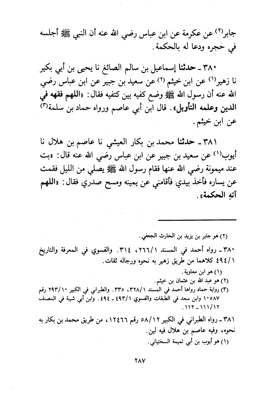 380 - حَدَّثَنَا إِسْمَاعِيلُ بْنُ سَالِمٍ الصَّائِغُ، نا يَحْيَى بْنُ أَبِي بُكَيْرٍ، نا زُهَيْرٌ، عَنِ ابْنِ خُثَيْمٍ، عَنْ سَعِيدِ بْنِ جُبَيْرٍ، عَنِ ابْنِ عَبَّاسٍ رَضِيَ اللَّهُ عَنْهُ، أَنَّ رَسُولَ اللَّهِ صَلَّى اللهُ عَلَيْهِ وَسَلَّمَ، وَضَعَ كَفَّيْهِ بَيْنَ كَتِفَيْهِ، فَقَالَ: «§اللَّهُمَّ فَقِّهْهُ فِي الدِّينِ، وَعَلِّمْهُ التَّأْوِيلَ» قَالَ ابْنُ أَبِي عَاصِمٍ: وَرَوَاهُ حَمَّادُ بْنُ سَلَمَةَ، عَنِ ابْنِ خُثَيْمٍ