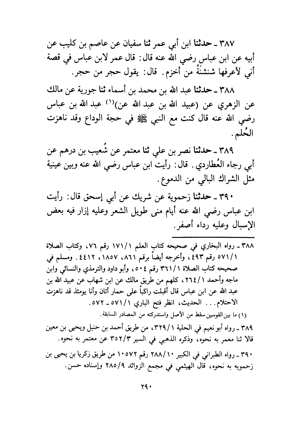 390 - حَدَّثَنَا زَحْمَوَيْهِ، عَنْ شَرِيكٍ، عَنْ أَبِي إِسْحَاقَ، قَالَ: «رَأَيْتُ §ابْنَ عَبَّاسٍ رَضِيَ اللَّهُ عَنْهُ، أَيَّامَ مِنًى طَوِيلَ الشَّعَرِ، وَعَلَيْهِ إِزَارٌ فِيهِ بَعْضُ الْإِسْبَالِ وَعَلَيْهِ رِدَاءٌ أَصْفَرُ»