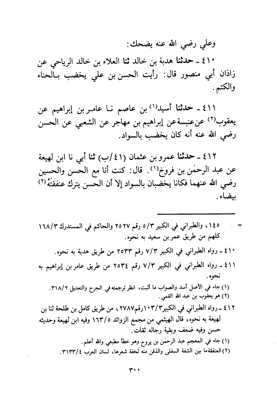 410 - حَدَّثَنَا هُدْبَةُ بْنُ خَالِدٍ، ثنا الْعَلَاءُ بْنُ خَالِدٍ الرِّيَاحِيُّ، عَنْ زَاذَانَ أَبِي مَنْصُورٍ، قَالَ: «رَأَيْتُ §الْحَسَنَ بْنَ عَلِيٍّ، يَخْضِبُ بِالْحِنَّاءِ وَالْكَتَمِ»