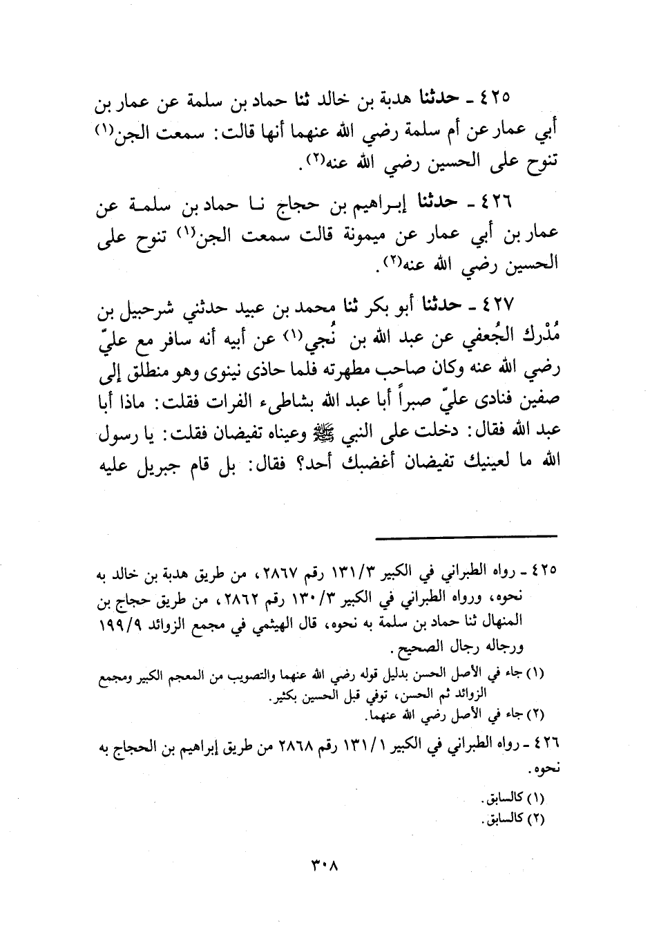 425 - حَدَّثَنَا هُدْبَةُ بْنُ خَالِدٍ، ثنا حَمَّادُ بْنُ سَلَمَةَ، عَنْ عَمَّارِ بْنِ أَبِي عَمَّارٍ، عَنْ أُمِّ سَلَمَةَ رَضِيَ اللَّهُ عَنْهُمَا أَنَّهَا قَالَتْ: «سَمِعْتُ §الْجِنَّ تَنُوحُ عَلَى الْحُسَيْنِ رَضِيَ اللَّهُ عَنْهُ»