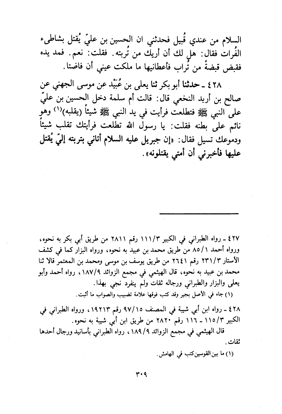 428 - حَدَّثَنَا أَبُو بَكْرٍ، ثنا يَعْلَى بْنُ عُبَيْدِ، عَنْ مُوسَى الْجُهَنِيٍّ، عَنْ صَالِحِ بْنِ أَرْبَدَ النَّخَعِيِّ، قَالَ: قَالَتْ أُمُّ سَلَمَةَ: دَخَلَ الْحُسَيْنُ بْنُ عَلِيٍّ عَلَى النَّبِيِّ صَلَّى اللهُ عَلَيْهِ وَسَلَّمَ، فَتَطَلَّعْتُ فَرَأَيْتُ فِي يَدِ النَّبِيِّ صَلَّى اللهُ عَلَيْهِ وَسَلَّمَ، شَيْئًا يُقَلِّبَهُ وَهُوَ نَائِمٌ عَلَى بَطْنِهِ، فَقُلْتُ: يَا رَسُولَ اللَّهِ، تَطَلَّعْتُ فَرَأَيْتُكَ تُقَلِّبُ شَيْئًا وَدُمُوعُكَ تَسِيلُ. فَقَالَ: «إِنَّ §جِبْرِيلَ عَلَيْهِ السَّلَامُ أَتَانِي بِتُرْبَتِهِ الَّتِي يُقْتَلُ عَلَيْهَا، فَأَخْبَرَنِي أَنَّ أُمَّتِي يَقْتُلُونَهُ»