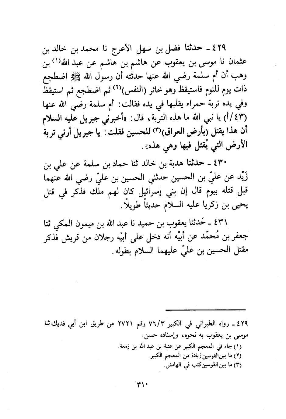 429 - حَدَّثَنَا فَضْلُ بْنُ سَهْلٍ الْأَعْرَجُ، نا مُحَمَّدُ بْنُ خَالِدِ بْنِ عُثْمَانَ، نا مُوسَى بْنُ يَعْقُوبَ، عَنْ هَاشِمِ بْنِ هَاشِمٍ، عَنْ عَبْدِ اللَّهِ بْنِ وَهْبٍ، أَنَّ أُمَّ سَلَمَةَ رَضِيَ اللَّهُ عَنْهَا، حَدَّثَتْهُ، أَنَّ رَسُولَ اللَّهِ صَلَّى اللهُ عَلَيْهِ وَسَلَّمَ اضْطَجَعَ ذَاتَ يَوْمٍ لِلنَّوْمِ، فَاسْتَيْقَظَ وَهُوَ خَائُرُ النَّفْسِ، ثُمَّ اضْطَجَعَ، ثُمَّ اسْتَيْقَظَ وَفِي يَدِهِ تُرْبَةٌ حَمْرَاءُ يُقَلِّبُهَا فِي يَدِهِ، فَقَالَتْ أُمُّ سَلَمَةَ رَضِيَ اللَّهُ عَنْهَا: يَا نَبِيَّ اللَّهِ مَا هَذِهِ التُّرْبَةُ قَالَ: «§أَخْبَرَنِي جِبْرِيلُ عَلَيْهِ السَّلَامُ، أَنَّ هَذَا يُقْتَلُ بِأَرْضِ الْعِرَاقِ، لِلْحُسَيْنِ» ، فَقُلْتُ: «يَا جِبْرِيلُ أَرِنِي تُرْبَةَ الْأَرْضِ الَّتِي يُقْتَلُ فِيهَا وَهِيَ هَذِهِ»