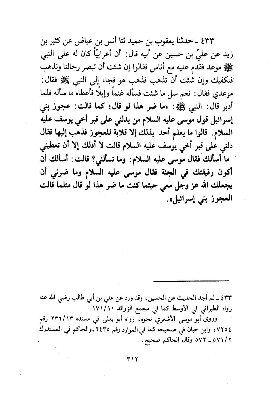 433 - حَدَّثَنَا يَعْقُوبُ بْنُ حُمَيْدٍ، ثنا أَنَسُ بْنُ عِيَاضٍ، عَنْ كَثِيرِ بْنِ زَيْدٍ، عَنْ عَلِيِّ بْنِ حُسَيْنٍ، عَنْ أَبِيهِ، قَالَ: أَنَّ أَعْرَابِيًّا كَانَ لَهُ عَلَى النَّبِيِّ صَلَّى اللهُ عَلَيْهِ وَسَلَّمَ، مَوْعِدٌ فَقَدِمَ عَلَيْهِ مَعَ أُنَاسٍ فَقَالُوا: إِنْ شِئْتَ أَنْ تَبْصُرَ رِجَالَنَا وَنَذْهَبُ فَنَكْفِيَكَ، وَإِنْ شِئْتَ أَنْ تَذْهَبَ. فَذَهَبَ هُوَ فَجَاءَ إِلَى النَّبِيِّ صَلَّى اللهُ عَلَيْهِ وَسَلَّمَ، فَقَالَ: مَوْعِدِي. فَقَالَ: «نَعَمْ، سَلْ مَا شِئْتَ» فَسَأَلَهُ غَنَمًا وَإِبِلًا، فَأَعْطَاهُ مَا سَأَلَهُ، فَلَمَّا أَدْبَرَ، قَالَ النَّبِيُّ صَلَّى اللهُ عَلَيْهِ وَسَلَّمَ: " §مَا ضَرَّ هَذَا لَوْ قَالَ كَمَا قَالَتْ عَجُوزُ بَنِي إِسْرَائِيلَ قَوْلُ مُوسَى عَلَيْهِ السَّلَامُ، مَنْ يَدُلُّنِي عَلَى قَبْرِ أَخِي يُوسُفَ عَلَيْهِ السَّلَامُ، قَالُوا: مَا يَعْلَمُ أَحَدٌ بِذَلِكَ إِلَّا قِلَابَةُ لِلْعَجُوزِ. فَذَهَبَ إِلَيْهَا فَقَالَ: دُلِّينِي عَلَى قَبْرِ أَخِي يُوسُفَ عَلَيْهِ السَّلَامُ قَالَتْ: لَا أَدُلُّكَ إِلَّا أَنْ تُعْطِيَنِي مَا أَسْأَلُكَ. فَقَالَ مُوسَى عَلَيْهِ السَّلَامُ: وَمَا تَسْأَلُنِي؟ قَالَتْ: أَسْأَلُكَ أَنْ أَكُونَ رَفِيقَتَكَ فِي الْجَنَّةِ. فَقَالَ مُوسَى عَلَيْهِ السَّلَامُ: وَمَا ضَرَّنِي أَنْ يَجْعَلَكِ اللَّهُ عَزَّ وَجَلَّ مَعِي حَيْثُمَا كُنْتُ. مَا ضَرَّ هَذَا لَوْ قَالَ مِثْلَمَا، قَالَتِ عَجُوزُ بَنِي إِسْرَائِيلَ "