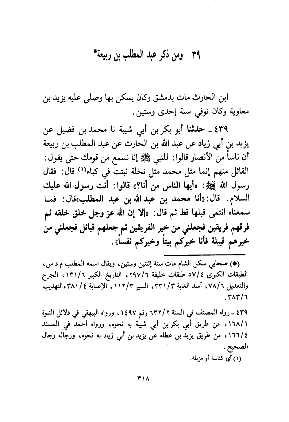 439 - حَدَّثَنَا أَبُو بَكْرِ بْنُ أَبِي شَيْبَةَ، نا مُحَمَّدُ بْنُ فُضَيْلٍ، عَنْ يَزِيدَ بْنِ أَبِي زِيَادٍ، عَنْ عَبْدِ اللَّهِ بْنِ الْحَارِثِ، عَنْ عَبْدِ الْمُطَّلِبِ بْنِ رَبِيعَةَ أَنَّ نَاسًا مِنَ الْأَنْصَارِ، قَالُوا لِلنَّبِيِّ صَلَّى اللهُ عَلَيْهِ وَسَلَّمَ: إِنَّا نَسْمَعُ مِنْ قَوْمِكَ حَتَّى يَقُولَ الْقَائِلُ مِنْهُمْ: إِنَّمَا مَثَلُ مُحَمَّدٍ نَخْلَةٌ نَبَتَتْ فِي كِبَاءٍ قَالَ: فَقَالَ رَسُولُ اللَّهِ صَلَّى اللهُ عَلَيْهِ وَسَلَّمَ: «أَيُّهَا النَّاسُ، مَنْ أَنَا؟» قَالُوا: أَنْتَ رَسُولُ اللَّهِ عَلَيْكَ السَّلَامُ قَالَ: «أَنَا مُحَمَّدُ بْنُ عَبْدِ اللَّهِ بْنِ عَبْدِ الْمُطَّلِبِ» قَالَ: فَمَا سَمِعْنَاهُ انْتَمَى قَبْلَهَا قَطُّ، ثُمَّ قَالَ: «أَلَا إِنَّ §اللَّهَ عَزَّ وَجَلَّ خَلَقَ خَلْقَهُ، ثُمَّ فَرَّقَهُمْ فَرِيقَيْنِ فَجَعَلَنِي مِنْ خَيْرِ الْفَرِيقَيْنِ، ثُمَّ جَعَلَهُمْ قَبَائِلَ فَجَعَلَنِي مِنْ خَيْرِهِمْ قَبِيلَةً، فَأَنَا خَيْرُكُمْ بَيْتًا وَخَيْرُكُمْ نَفْسًا»