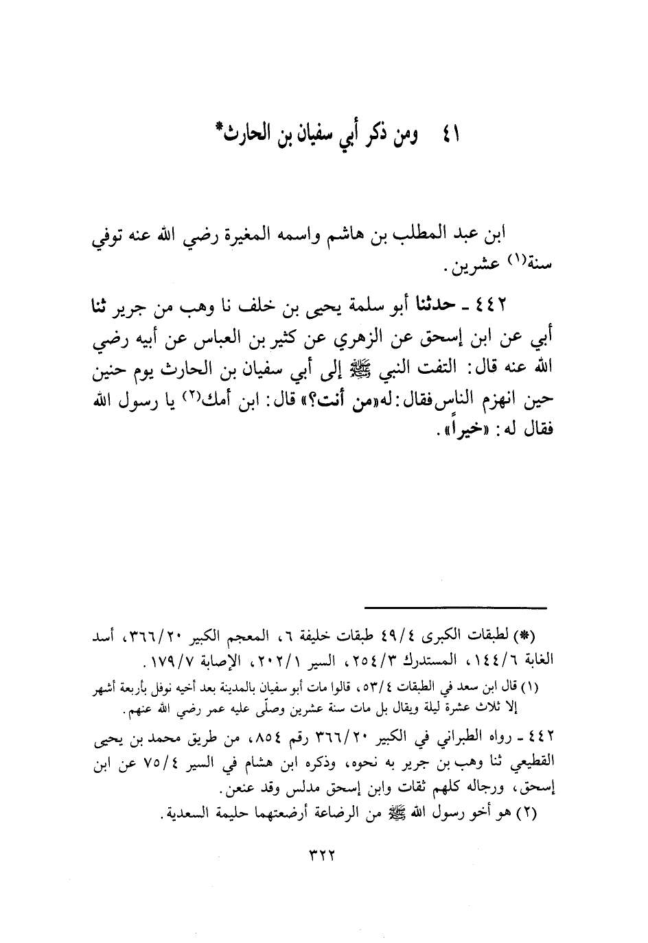 §وَمِنْ ذِكْرِ أَبِي سُفْيَانَ بْنِ الْحَارِثِ بْنِ عَبْدِ الْمُطَّلِبِ بْنِ هَاشِمٍ وَاسْمُهُ الْمُغِيرَةُ رَضِيَ اللَّهُ عَنْهُ تُوُفِّيَ سَنَةَ عِشْرِينَ