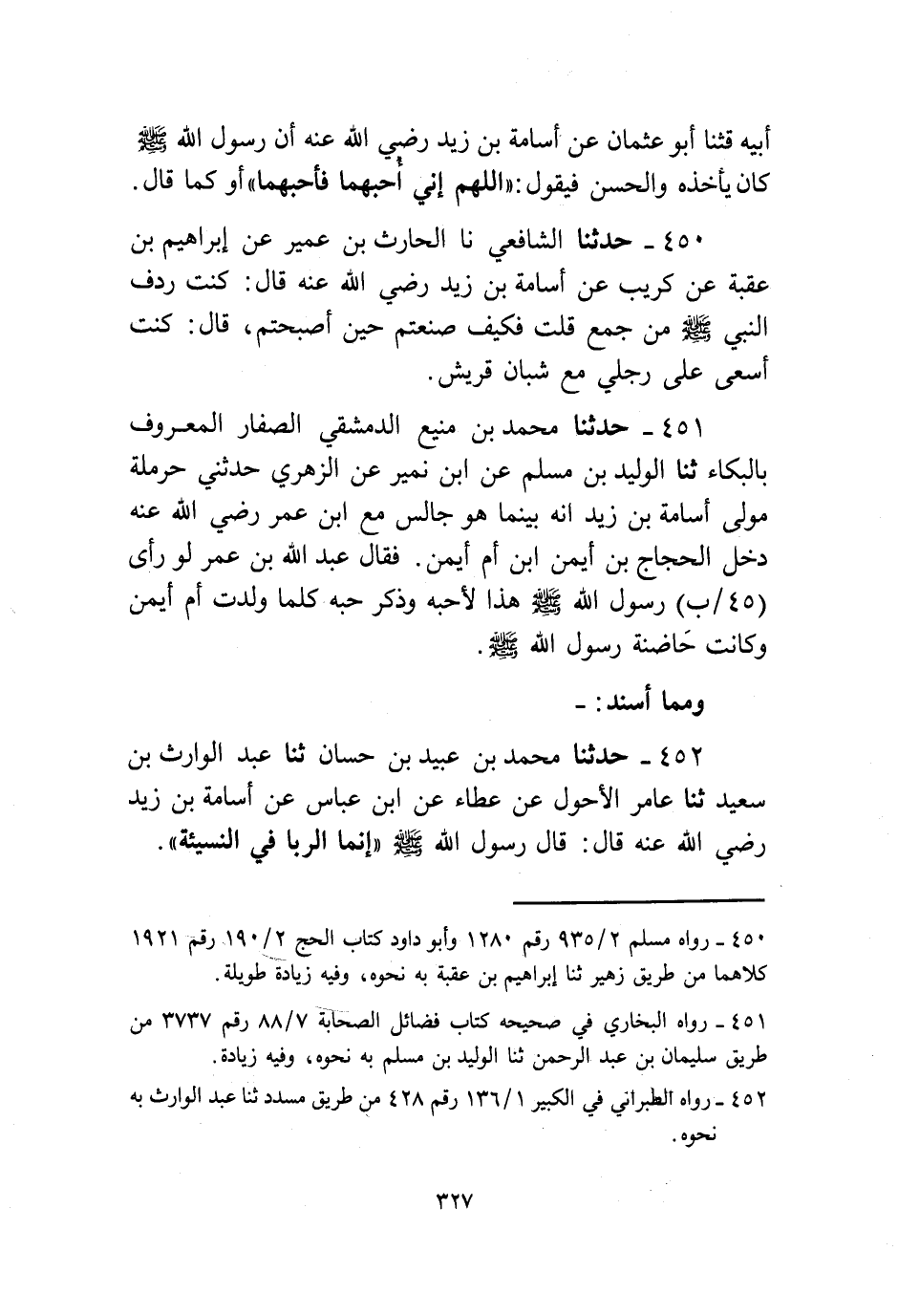 452 - حَدَّثَنَا مُحَمَّدُ بْنُ عُبَيْدِ بْنِ حَسَّابٍ، ثنا عَبْدُ الْوَارِثِ بْنُ سَعِيدٍ، ثنا عَامِرٌ الْأَحْوَلُ، عَنْ عَطَاءٍ، عَنِ ابْنِ عَبَّاسٍ، عَنْ أُسَامَةَ بْنِ زَيْدٍ رَضِيَ اللَّهُ عَنْهُ، قَالَ: قَالَ رَسُولُ اللَّهِ صَلَّى اللهُ عَلَيْهِ وَسَلَّمَ: «§إِنَّمَا الرِّبَا فِي النَّسِيئَةِ»