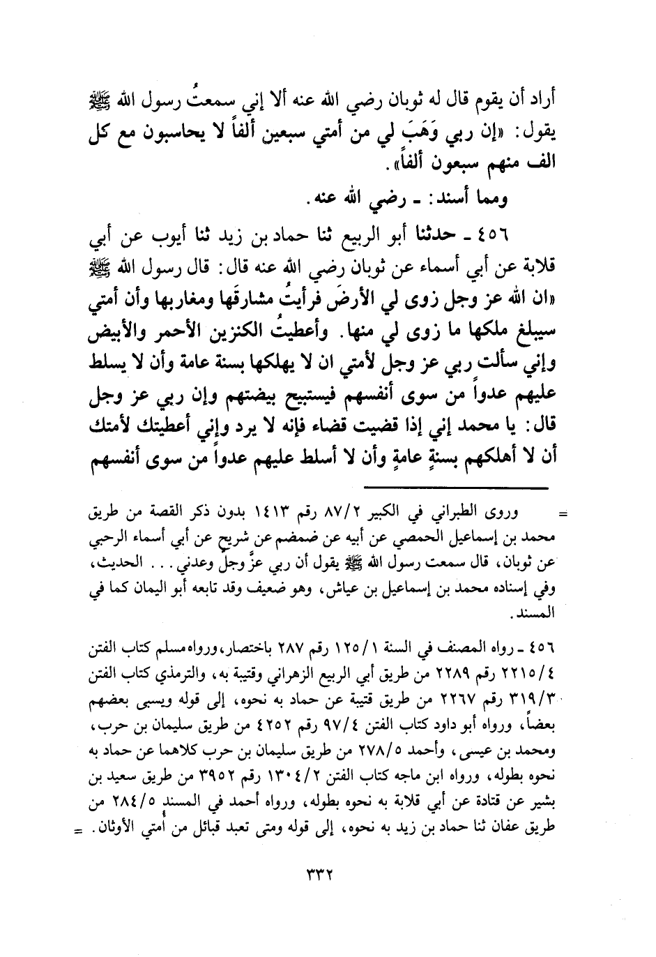 456 - حَدَّثَنَا أَبُو الرَّبِيعِ، ثنا حَمَّادُ بْنُ زَيْدٍ، ثنا أَيُّوبُ، عَنْ أَبِي قِلَابَةَ، عَنْ أَبِي أَسْمَاءَ، عَنْ ثَوْبَانَ رَضِيَ اللَّهُ عَنْهُ، قَالَ: قَالَ رَسُولُ اللَّهِ صَلَّى اللهُ عَلَيْهِ وَسَلَّمَ: " إِنَّ §اللَّهَ عَزَّ وَجَلَّ زَوَى لِي الْأَرْضَ فَرَأَيْتُ مَشَارِقَهَا وَمَغَارِبَهَا، وَإِنَّ أُمَّتِي سَيَبْلُغُ مُلْكُهَا مَا زَوَى لِي مِنْهَا، وَأُعْطِيتُ الْكَنْزَيْنِ الْأَحْمَرَ وَالْأَبْيَضَ، وَإِنِّي سَأَلْتُ رَبِّي عَزَّ وَجَلَّ لِأُمَّتِي أَنْ لَا يُهْلِكَهَا بِسَنَةٍ عَامَّةٍ، وَأَنْ لَا يُسَلَّطَ عَلَيْهِمْ عَدُوًّا مِنْ سِوَى أَنْفُسِهِمْ فَيَسْتَبِيحَ بَيْضَتَهُمْ، وَإِنَّ رَبِّي عَزَّ وَجَلَّ قَالَ: يَا مُحَمَّدُ، إِنِّي إِذَا قَضَيْتُ قَضَاءً فَإِنَّهُ لَا يُرَدُّ وَإِنِّي أَعْطَيْتُكَ لِأُمَّتِكَ أَنْ لَا أُهْلِكَهُمْ بِسَنَةٍ عَامَّةٍ، وَأَنْ لَا أُسَلِّطَ عَلَيْهِمْ عَدُوًّا مِنْ سِوَى أَنْفُسِهِمْ فَيَسْتَبِيحَ بَيْضَتَهُمْ وَلَوِ اجْتَمَعَ عَلَيْهِمْ مِنْ بَيْنِ أَقْطَارِهَا حَتَّى يَكُونَ بَعْضُهُمْ يُهْلِكَ بَعْضًا وَبَعْضُهُمْ يَسْبِي بَعْضًا، وَإِنَّ أَخْوَفَ مَا أَخَافُ عَلَى أُمَّتِي الْأَئِمَّةُ الْمُضِلِّينَ، وَلَا تَقُومُ السَّاعَةُ حَتَّى تَلْحَقَ قَبَائِلُ مِنْ أُمَّتِيَ الْمُشْرِكِينَ وَحَتَّى تُعْبَدَ الْأَوْثَانُ، وَإِنَّهُ سَيَكُونُ فِي أُمَّتِي ثَلَاثُونَ كَذَّابًا كُلُّهُمْ يَزْعُمُ أَنَّهُ نَبِيٌّ، وَإِنَّهُ لَا نَبِيَّ بَعْدِي وَإِنَّهُ لَا تَزَالُ طَائِفَةٌ مِنْ أُمَّتِي عَلَى الْحَقِّ ظَاهِرِينَ لَا يَضُرُّهُمْ مَنْ خَذَلَهُمْ حَتَّى يَأْتِيَ أَمْرُ اللَّهِ عَزَّ وَجَلَّ وَهِيَ كَذَلِكَ "