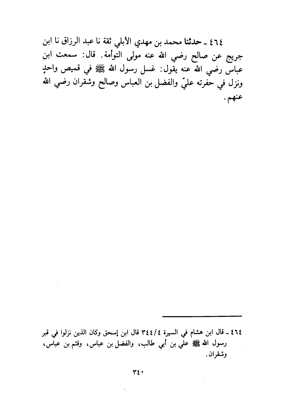 464 - حَدَّثَنَا مُحَمَّدُ بْنُ مَهْدِيٍّ الْأُبُلِّيُّ، ثِقَةٌ، نا عَبْدُ الرَّزَّاقِ، نا ابْنُ جُرَيْجٍ، عَنْ صَالِحٍ، رَضِيَ اللَّهُ عَنْهُ، مَوْلَى التَّوْأَمَةِ، قَالَ: سَمِعْتُ ابْنَ عَبَّاسٍ رَضِيَ اللَّهُ عَنْهُ، يَقُولُ: «§غُسِّلَ رَسُولُ اللَّهِ صَلَّى اللهُ عَلَيْهِ وَسَلَّمَ، فِي قَمِيصٍ وَاحِدٍ، وَنَزَلَ فِي حُفْرَتِهِ عَلِيٌّ، وَالْفَضْلُ بْنُ الْعَبَّاسِ، وَصَالِحٌ، وَشُقْرَانُ رَضِيَ اللَّهُ عَنْهُمْ»