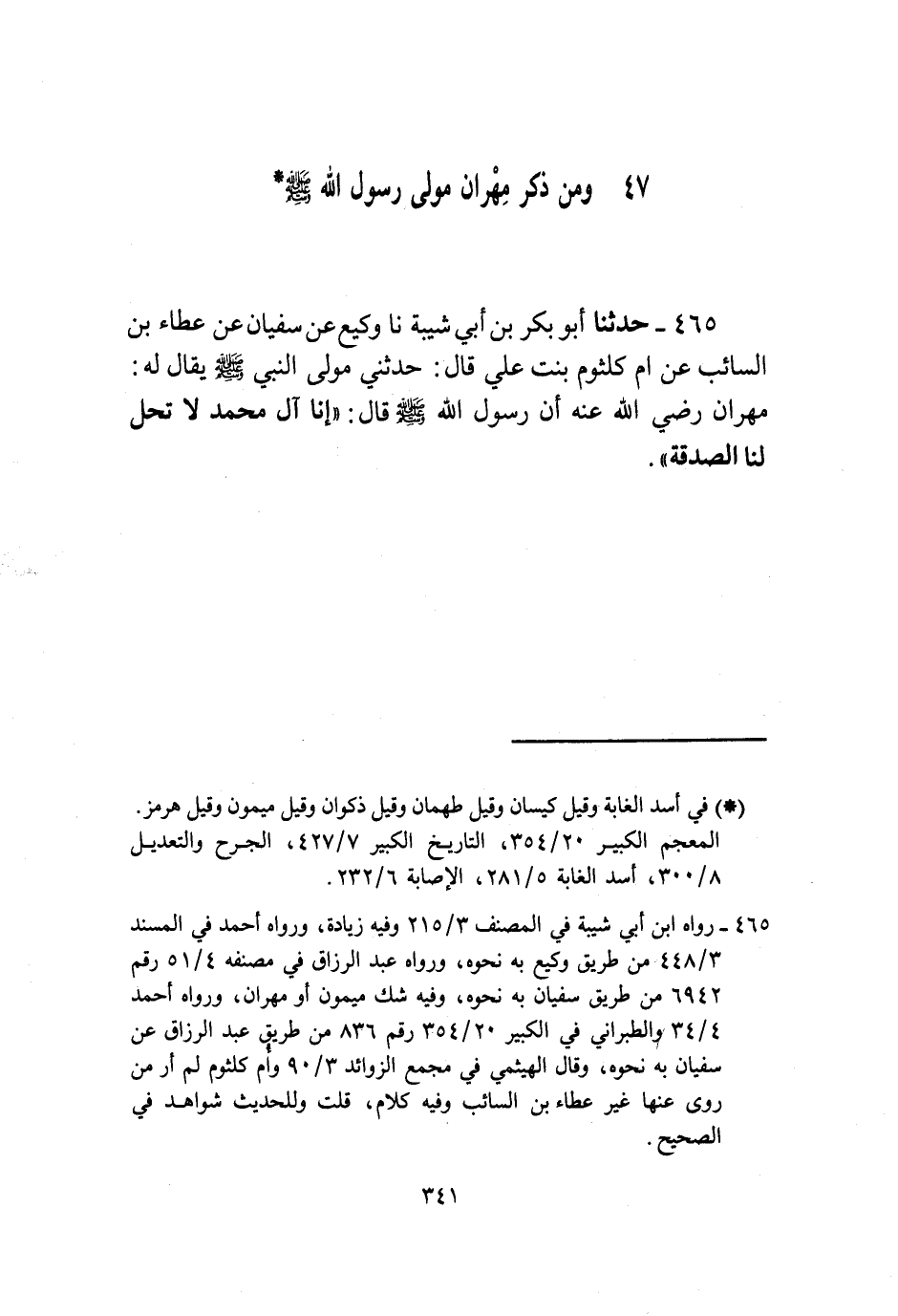 465 - حَدَّثَنَا أَبُو بَكْرِ بْنُ أَبِي شَيْبَةَ، نا وَكِيعٌ، عَنْ سُفْيَانَ، عَنْ عَطَاءِ بْنِ السَّائِبِ، عَنْ أُمِّ كُلْثُومِ بِنْتِ عَلِيٍّ، قَالَتْ: حَدَّثَنِي مَوْلَى النَّبِيِّ صَلَّى اللهُ عَلَيْهِ وَسَلَّمَ، يُقَالُ لَهُ: مِهْرَانُ رَضِيَ اللَّهُ عَنْهُ، أَنَّ رَسُولَ اللَّهِ صَلَّى اللهُ عَلَيْهِ وَسَلَّمَ، قَالَ: «§إِنَّا آلُ مُحَمَّدٍ، لَا تَحِلُّ لَنَا الصَّدَقَةُ»