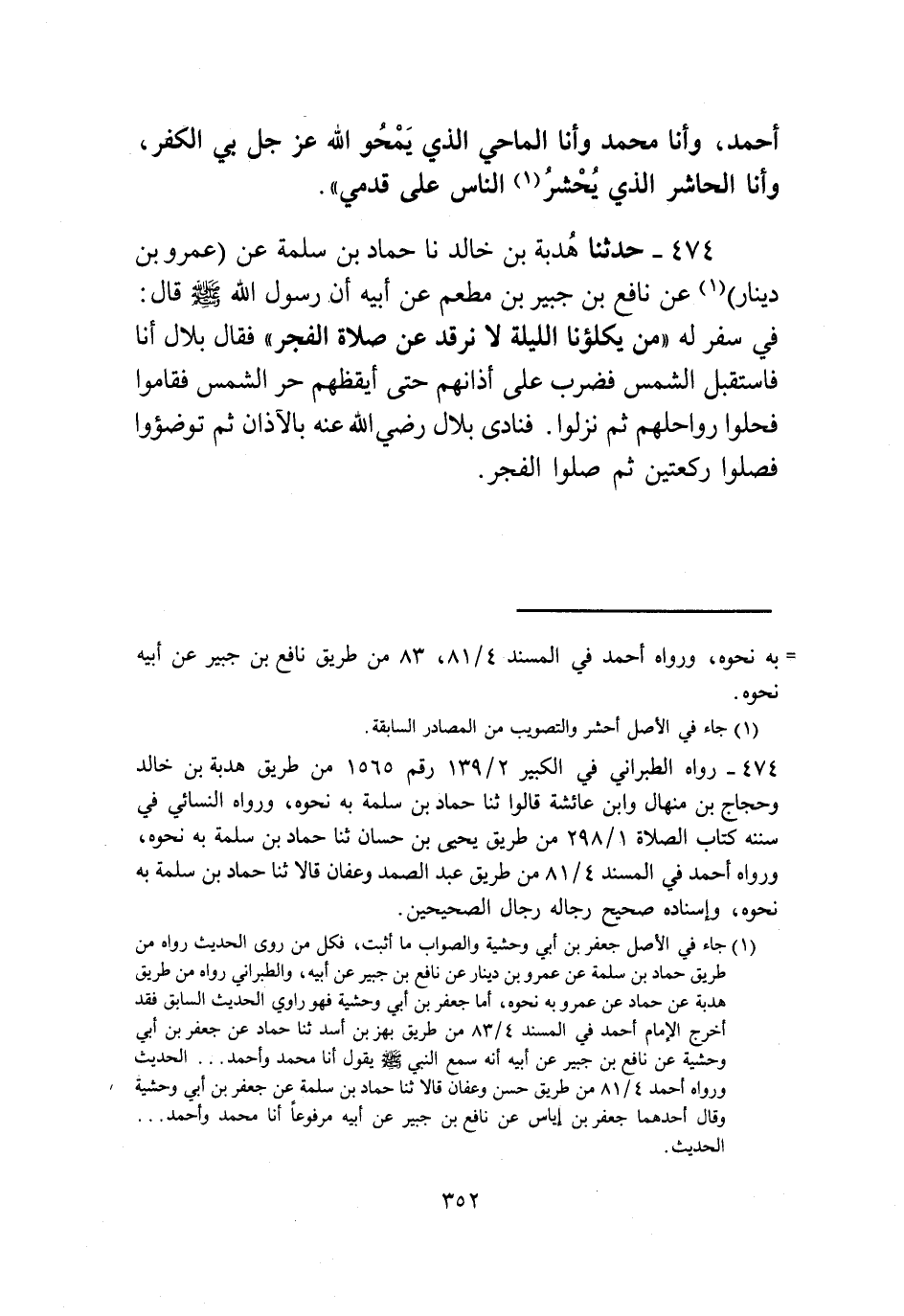 474 - حَدَّثَنَا هُدْبَةُ بْنُ خَالِدٍ، نا حَمَّادُ بْنُ سَلَمَةَ، عَنْ عَمْرِو بْنِ دِينَارٍ، عَنْ نَافِعِ بْنِ جُبَيْرِ بْنِ مُطْعِمٍ، عَنْ أَبِيهِ، أَنَّ رَسُولَ اللَّهِ صَلَّى اللهُ عَلَيْهِ وَسَلَّمَ، قَالَ فِي سَفَرٍ لَهُ: «§مَنْ يَكْلَؤُنَا اللَّيْلَةَ لَا نَرْقُدُ عَنْ صَلَاةِ الْفَجْرِ؟» فَقَالَ بِلَالٌ: أَنَا. فَاسْتَقْبَلَ الشَّمْسَ فَضَرَبَ عَلَى آذَانِهِمْ حَتَّى أَيْقَظَهُمْ حَرُّ الشَّمْسَ، فَقَامُوا فَحَلُّوا رَوَاحِلَهُمْ، ثُمَّ نَزَلُوا فَنَادَى بِلَالٌ رَضِيَ اللَّهُ عَنْهُ بِالْأَذَانِ، ثُمَّ تَوَضَّئُوا فَصَلَّوْا رَكْعَتَيْنِ، ثُمَّ صَلَّوُا الْفَجْرَ